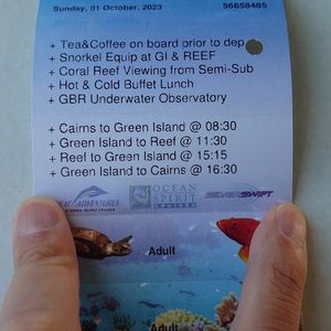 グリーン島でスキューバダイビングに参加したく、このツアーを予約しました。まず、グラスボトムボートで魚を見にました。運良く亀に遭遇することもできました。その後お昼を食べ、シュノーケルリングのセットを借り海に遊びに行きました。魚もいて楽しめました。その後スキューバダイビングに参加しました。色んな魚(シャコガイ、クマノミ、サメ)など楽しめました。スタッフが写真や動画も撮ってくれます。一枚30ドルの販売ですが、100ドルで全データをUSBでくれるのでお得です。