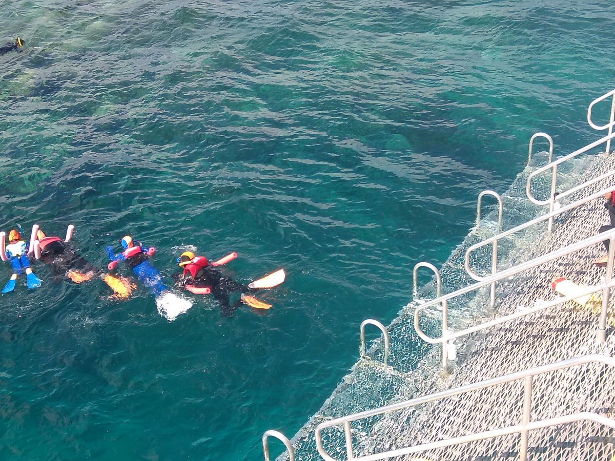 11月11日にアウターリーフツアーに参加しました。朝9時出港だったのでゆっくり準備が出来ました。乗船するとスタッフが丁寧にアクティビティーについて説明してくれました。ケアンズ港から約1時間半途中フィッツロイ島の横を通り、アウターリーフポンツーンに到着。スタッフがスティンガースーツを選んでくれ用具をつけて、シュノーケリング開始。ポンツーンから泳ぎ出すとすぐに美しい珊瑚礁と色とりどりの魚達が居ました。珊瑚礁に触れないように泳いでいたら、ナポレオンフィッシュがまるで我々に挨拶するかのように、フレンドリーに近付いてきました。一頻り珊瑚礁の周りをシュノーケリングし、ポンツーンに上がり美味しい昼食をとりました。充分に時間があったので、魚へ餌やりショーやグラスボートで珊瑚礁を回りました。ポンツーンに戻ってコーヒーとデニッシュを頂き、他の参加者と楽しい会話をすることが出来ました。帰りの船中では心地よく居眠りをしてしまい、いつの間にかケアンズ港に着いていました。下船する時スタッフ全員でお見送りしてくれました。私達はポンツーンでのシュノーケリングは3回目でしたが、機会があればまたツアーに参加したいと思います。(日本語のアクチビティ同意書が有ると良いと思います。)
