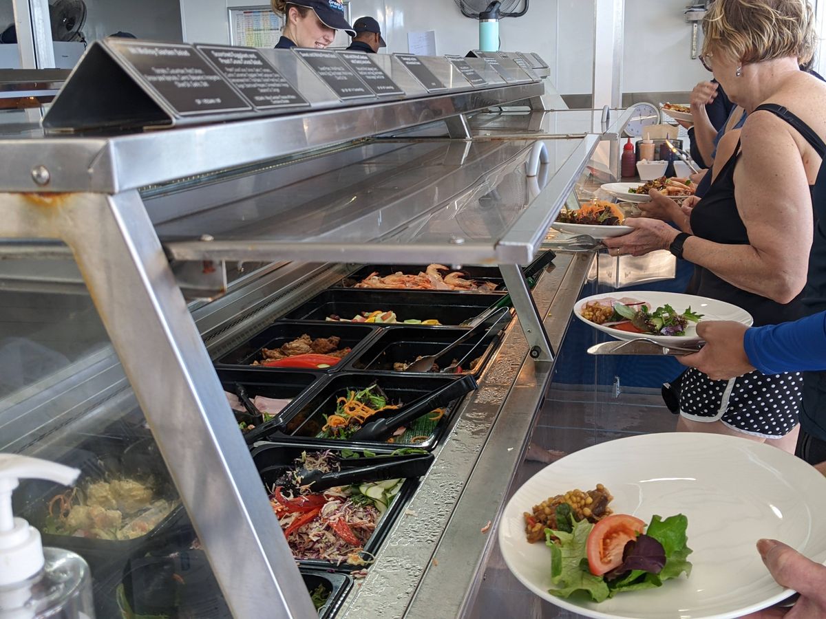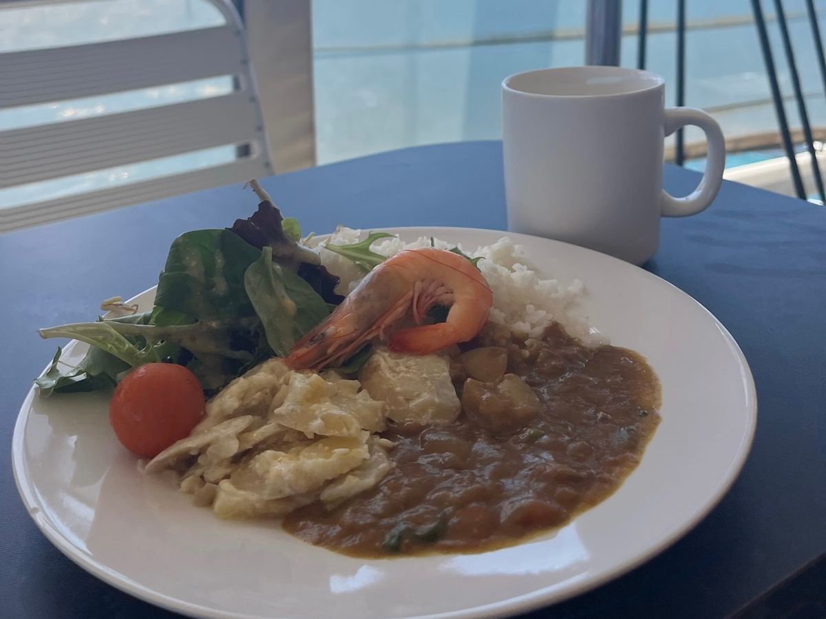 フェリーの中で、マフィンや温かい飲み物、昼はスパイスの効いたカレーやフレッシュ野菜、離島の際はシャンパンにフルーツなど、どれも美味しかったです!