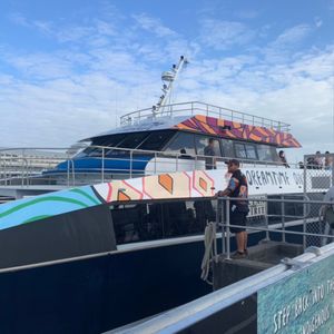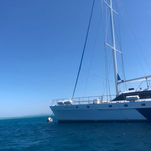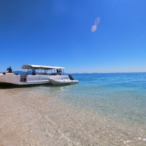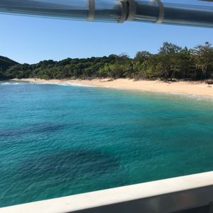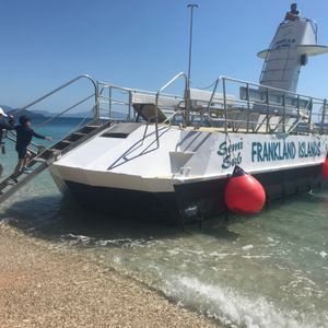 大型バスで日本人スタッフが迎えに来てくれて小1時間南に走ったあたりの川から船に乗りました。その分、船の時間が短いので酔いやすい妻には良かったと思います。船は大きくて立派でした。少し川を下って海に出て、その間にコーヒーや菓子が出たり、ウェットスーツやシュノーケル道具を借りたりして、海に出てからは割と短時間でフランクランド島まで着きました。島は砂浜と青い海が本当に綺麗で癒されました。シュノーケルツアーでは亀が見られたり40-50センチほどの魚が多くいて中々見応えがあり、5歳の息子も楽しんでいました。ただ8月だったので午前中は水温がかなり冷たくウェットを着てても長時間は入っていられませんでした。午後は気温が上がったのとラッシュガードをウェットの中に着たので問題なく入っていられました。半潜水艦もクリアに水中を見る事が出来て良かったです。ランチもそれなりにちゃんとしていました。帰りの船ではクジラに遭遇し、しばらくホエールウォッチングをさせてくれてラッキーでした。一点注意としては送迎代や写真購入などで追加のお金が結構かかりました。