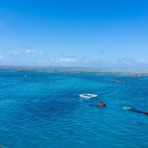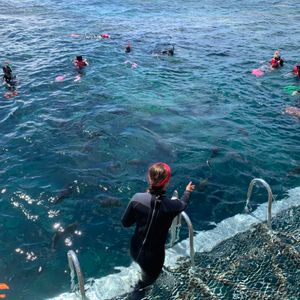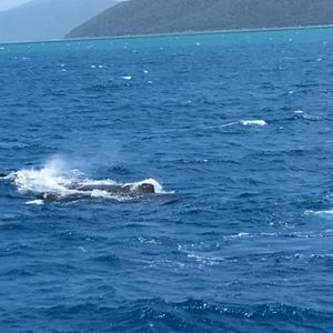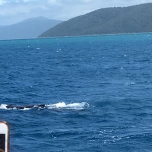 現地滞在時間が長い事とシュノーケルエリアが広いとの事がリーフマジックのツアーを選択した決め手でした。当日の参加者は欧米系8割、アジア系2割、内日本人は2組だけで日本人スタッフもいませんでしたが、特に不自由なく楽しめたかと思います。朝ケアンズ市内は曇っていましたがポンツーンは快晴であり、透明度の高いサンゴ礁の海を満喫できました。ただ海水温は低いためかウェットスーツを着ていても寒くなるので、子供は少し辛そうでした。デッキの日光浴で回復しましたが! 昼食も種類が多く温かいものもあり味も良かったと思います。そして最後にサプライズが!帰りの船内でウトウトしているとなぜかざわざわしだし船が停止。アナウンスでクジラがいると!あわててデッキに出て2頭で仲良く泳ぐクジラを見ることができました。