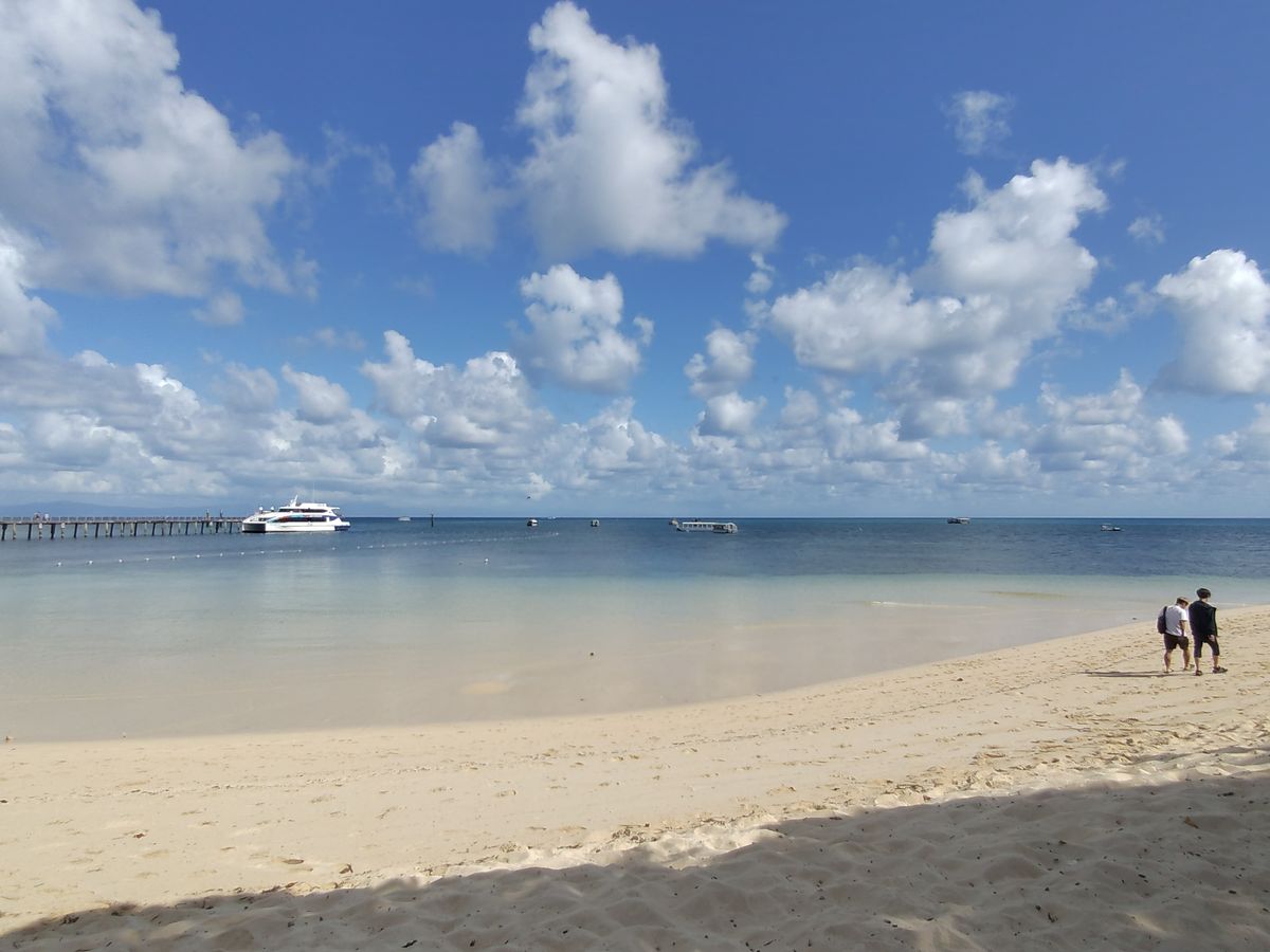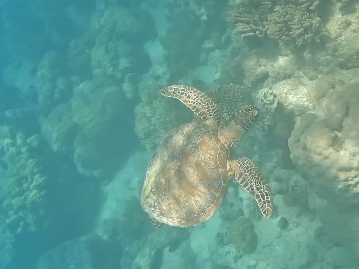 13時30分:ここから15時くらいまでは私たちは自由時間だったので、ずっと海で何かしらすることにしました。(14時くらいから島内散策ツアーに参加している方もいました。)私たちは初めのシュノーケリングでウミガメを見ることができなかったので、リベンジのためにもう一度挑戦することにしました。他のツアー参加者の中に、もう既にウミガメと遭遇した、という方がいらっしゃったのでその方にどこに居たかを聞いて、その辺りを探してみました。が、なかなか見つからず海の中を右往左往しました。すると砂浜にいたNanamiさんが、砂浜からウミガメを見えたらしく、私たちのウミガメ探しに協力してくれました!Nanamiさんの助けを借りながら捜索すること約10分、ようやくウミガメに遭遇できました!しかも思ったよりも大きくて驚き!!これだけでケアンズにきたかいがありました🐢Nanamiさんさいこう。そのウミガメはすぐにどこかに行ってしまいましたが、約15分後、もう一度ウミガメと遭遇できました!(←これもNanamiさんのおかげ)そのウミガメは泳ぐスピードがゆっくりだったので、数分間一緒に泳ぐことが出来ました!この日のために買った防水カメラも活躍したので買って良かったです📸シュノーケリングは大満足したので、最後に、やったことがなかったサップやボートを軽く乗って終了しました。サップやボートも無料で自由に好きなタイミングで使えました。