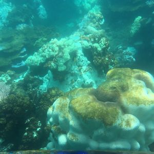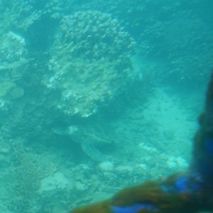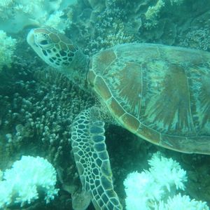 日本人ガイドさんの案内で、サンゴ礁やニモを見ました。透明度が高く手が届くくらいの浅いサンゴ礁を想像していましたが、期待していたよりは濁っていてサンゴも深いところにありました。ガイドさん曰く、参加日前の数日間、波が高かったからだそうです。サンゴを楽しんでいましたが、泳いでいる時間が長くて波に酔いました。一度上がって休憩の後、半潜水艦でした。船酔いをするのできれいなポイントに到着するまではデッキで過ごしました。その時に一瞬でしたがウミガメと遭遇しました!!