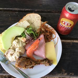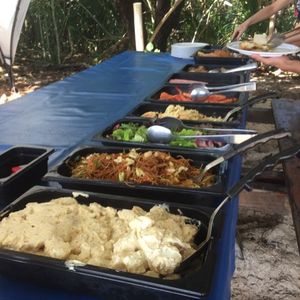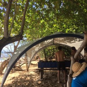 ランチはレストラン並みとは行かないまでも、無人島で頂くには十分な内容で、食後のフルーツもありました。冷たいお水もサーバーで用意されていて、行き帰りの船はコーヒーや紅茶のサービスもあるし、水筒を持参しましたが不要でした。