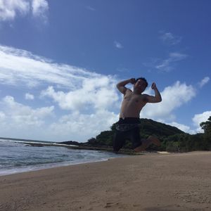 当日は風が強く船も揺れて気分が悪くなりどうなる事かと不安でしたが、ガイドの南さんがとてもよくして下さり、無事到着。島では天候に恵まれのんびりした一日を過ごせました。スノーケリングは泳ぎが苦手な主人はライフジャケットを借り、私は棒状の浮き輪を借りて参加。白波が立っていて透明度が悪く残念でしたがそれでも色とりどりの珊瑚のあるところまで連れて行ってもらい楽しめました。海からあがり、テンションがあがった主人は年甲斐もなく飛んでます!