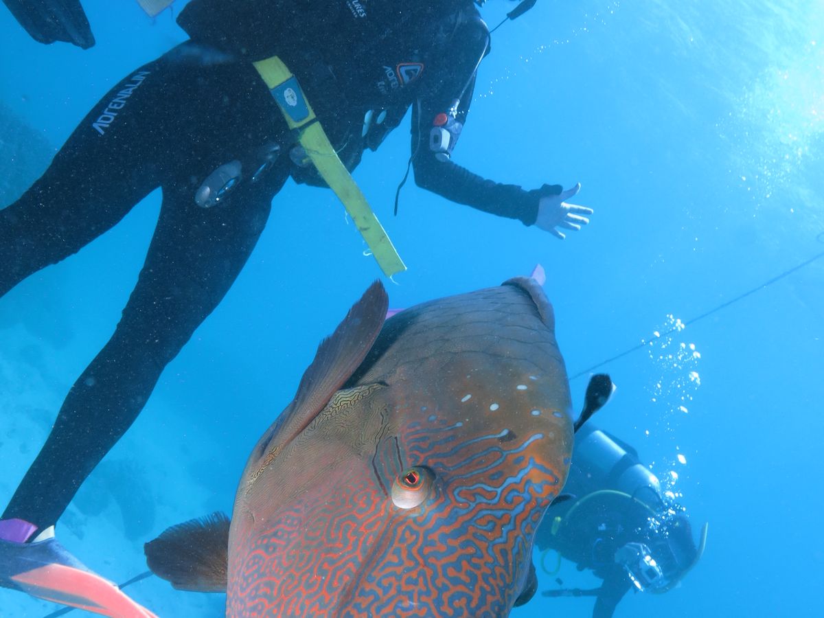 ポンツーンにナポレオンフィッシュが住みついているようで、ダイバーさんにすっかり懐き泳ぐナポレオンフィッシュをシュノーケリングでもすぐ近くに見ることができました!