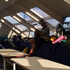 オプションで「体験ダイビング」を申し込んでいたので 到着するまで 体験ダイビングの説明があります。説明してくださる日本人の方が 面白おかしく説明してくれます。あまり長く2時間が感じることはなかったです。