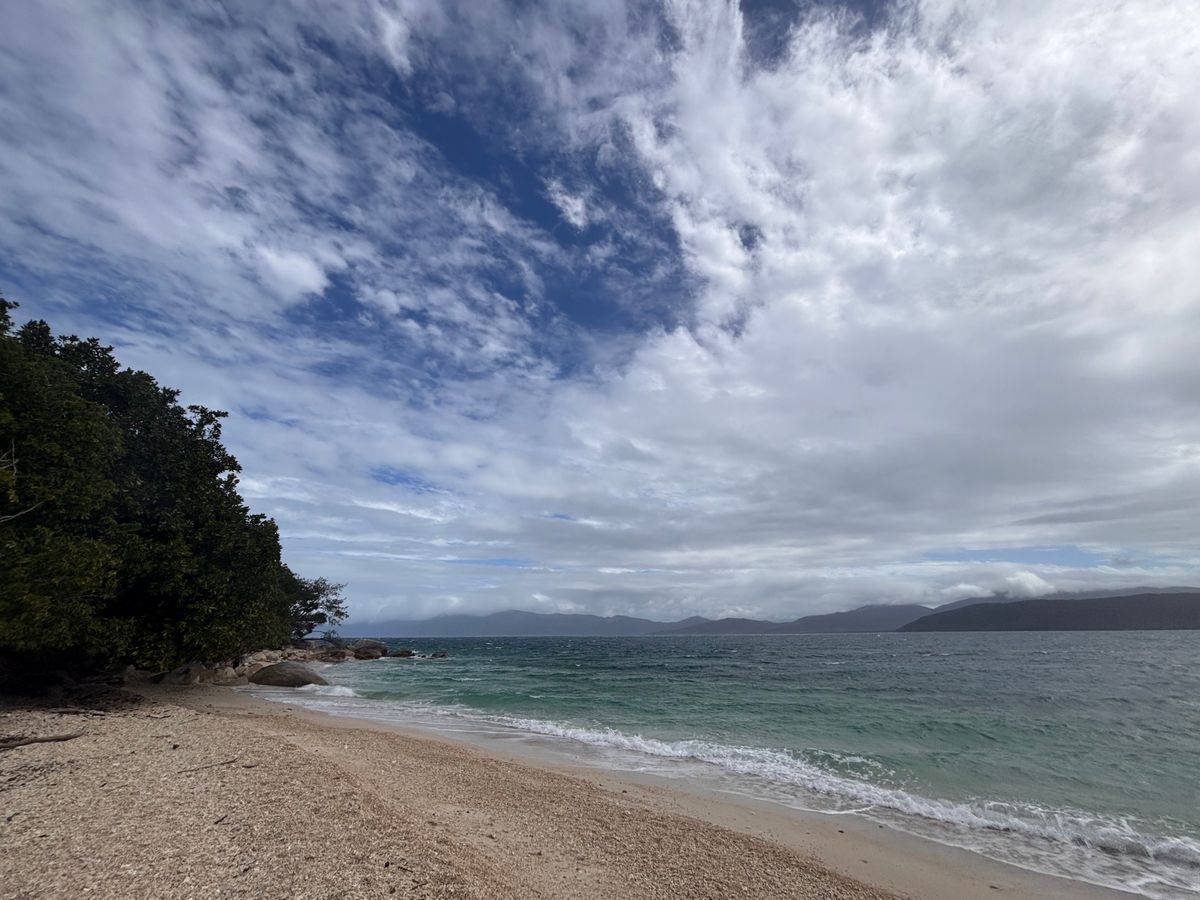 何度かケアンズの島には行っていますがこの時期がよくないのか船は揺れます。1時間の乗船でしたが風が強くデッキにはいられないほどでした。着いたときは晴れていましたが、シュノーケリングをしていたら冷たい雨となり上がった時は震えるほどでした。水温は24℃という事で水は冷たくはないですが、天気が悪いと体は冷えますね。一応冬なので。カフェで何とか暖を取り、午後はヌーディビーチに行きました。
