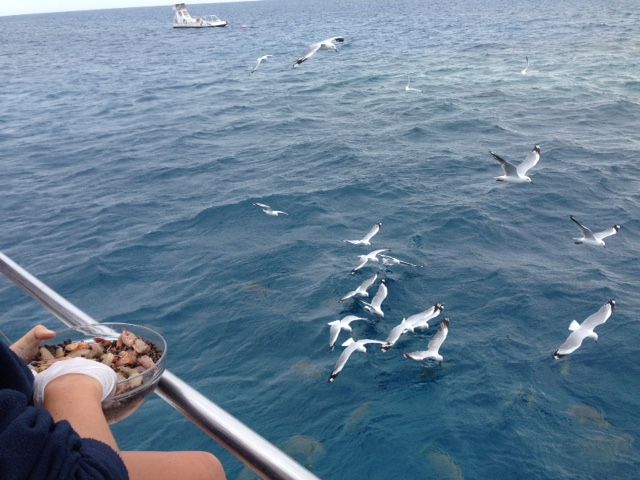 昼食後、シュノーケリングエリアの入り口で魚の餌付けをしてくれます。大きなナポレオンフィッシュが参加者の足元を泳ぎ回り、実際にさわることができ、子供は大喜びでした。