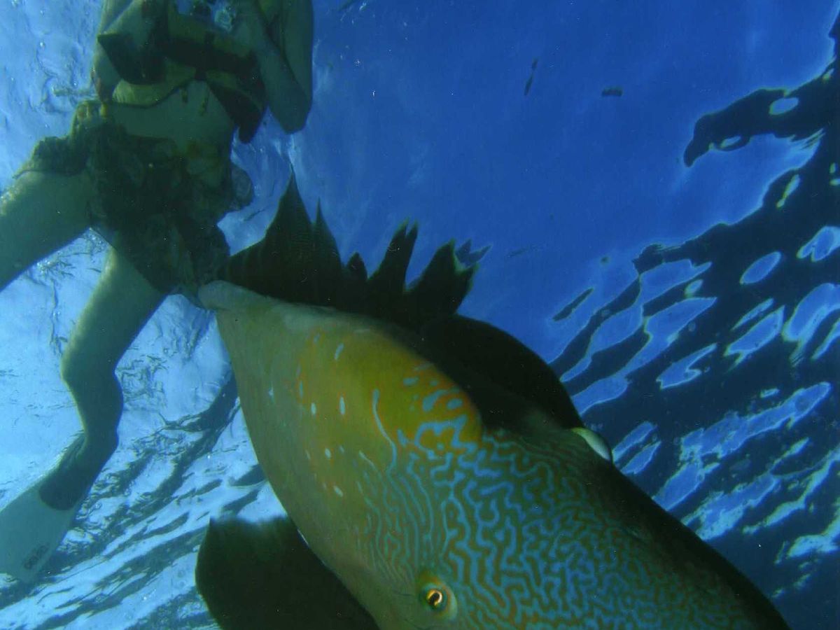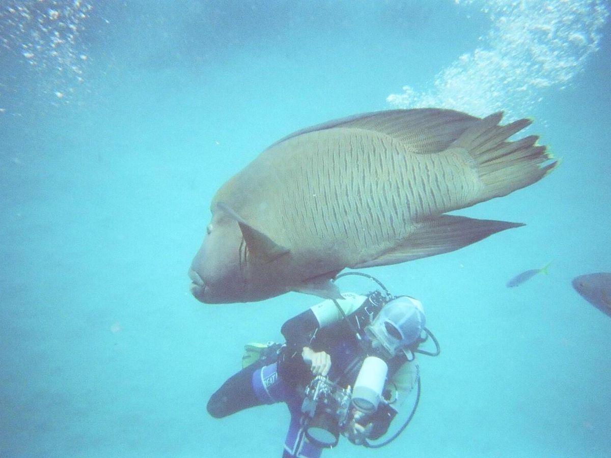 写真を撮ってくれているダイバーさんがナポレオンフィッシュを私達のほうに近づけてくれ一緒に写真も!