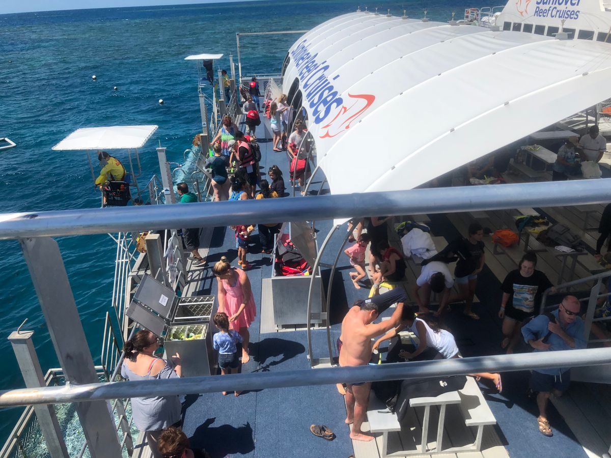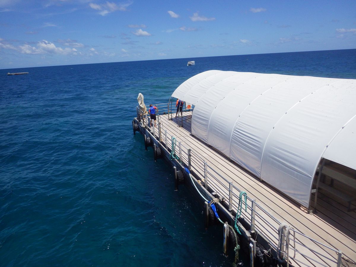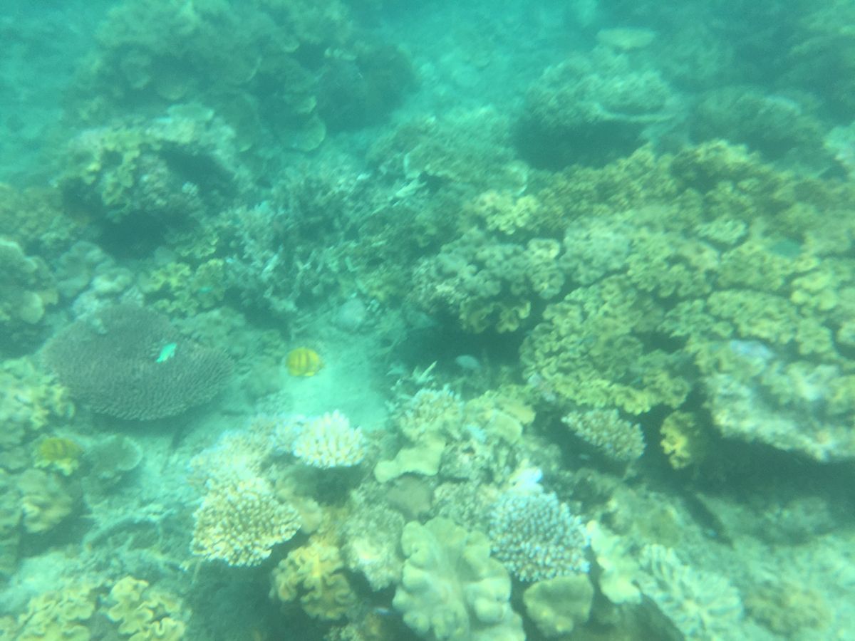 滞在中G.B.Rには2回参加しましたが、こちらはポンツーンを拠点にリーフの真上からシュノーケリングできるので、密度の高い、綺麗なサンゴをたくさん見る事ができます。魚もいっぱいいます。ポンツーンの真下あたりにダイバーさんたちがナポレオンフィッシュの餌付けをしていたので、それをシュノーケルで上から見ていました。食事もまあまあです。事前に酔い止めを飲んでいたおかげか、行きも帰りも船酔いすることはなかったです。
