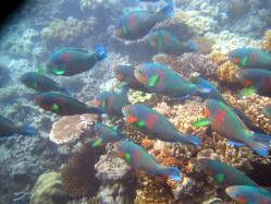 50匹はいるブダイの群れに遭遇。青いブダイの中に赤いブダイが一匹。とてもキレイでした。