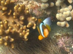 その後は、珊瑚のキレイな辺りをプカプカ浮いてみていると、ニモの仲間クマノミも発見。