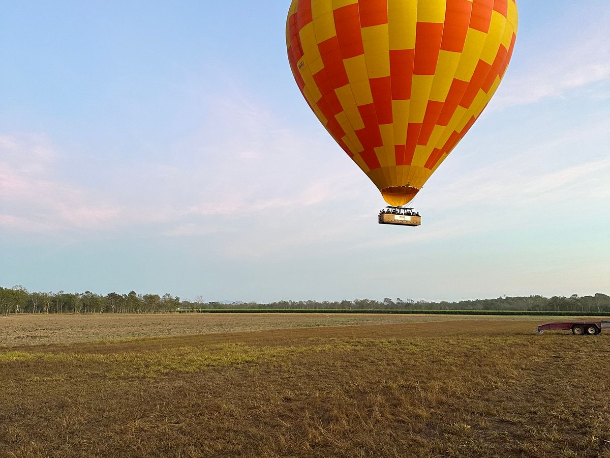 5.おおよそ、40分-50分ぐらいの飛行でした。朝日がとても綺麗に見えたり、ケアンズ周辺の雄大な自然を見たりと本当に素晴らしいひとときでした。写真も撮れる余裕があるぐらいゆっくり移動してました。また、スタッフの方が気球に垂らしたカメラで乗っているところを撮ってくれます。