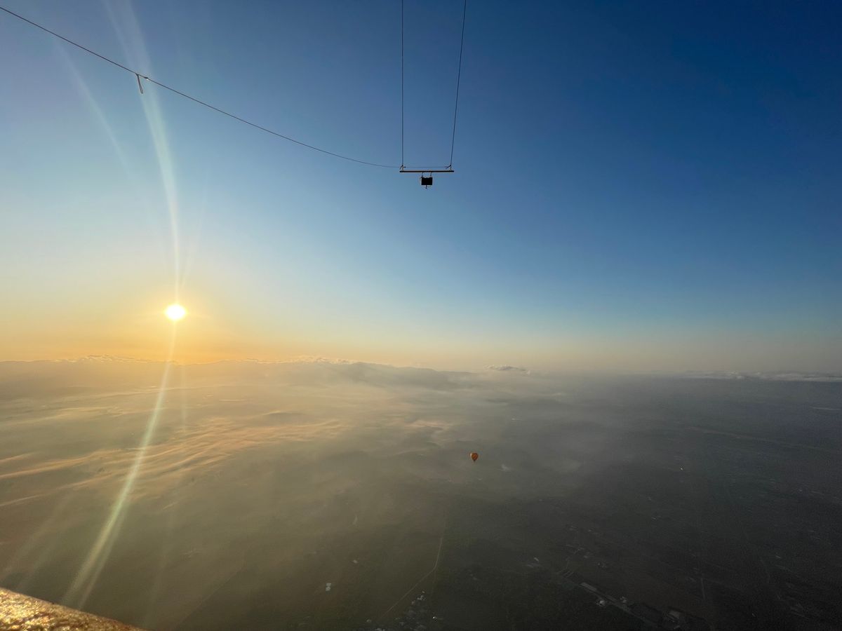 上空からの景色は、今まで見た事なく、大地と朝日がとても綺麗でした。遠くには別の気球も飛んでいるので、それも素敵な景色です。