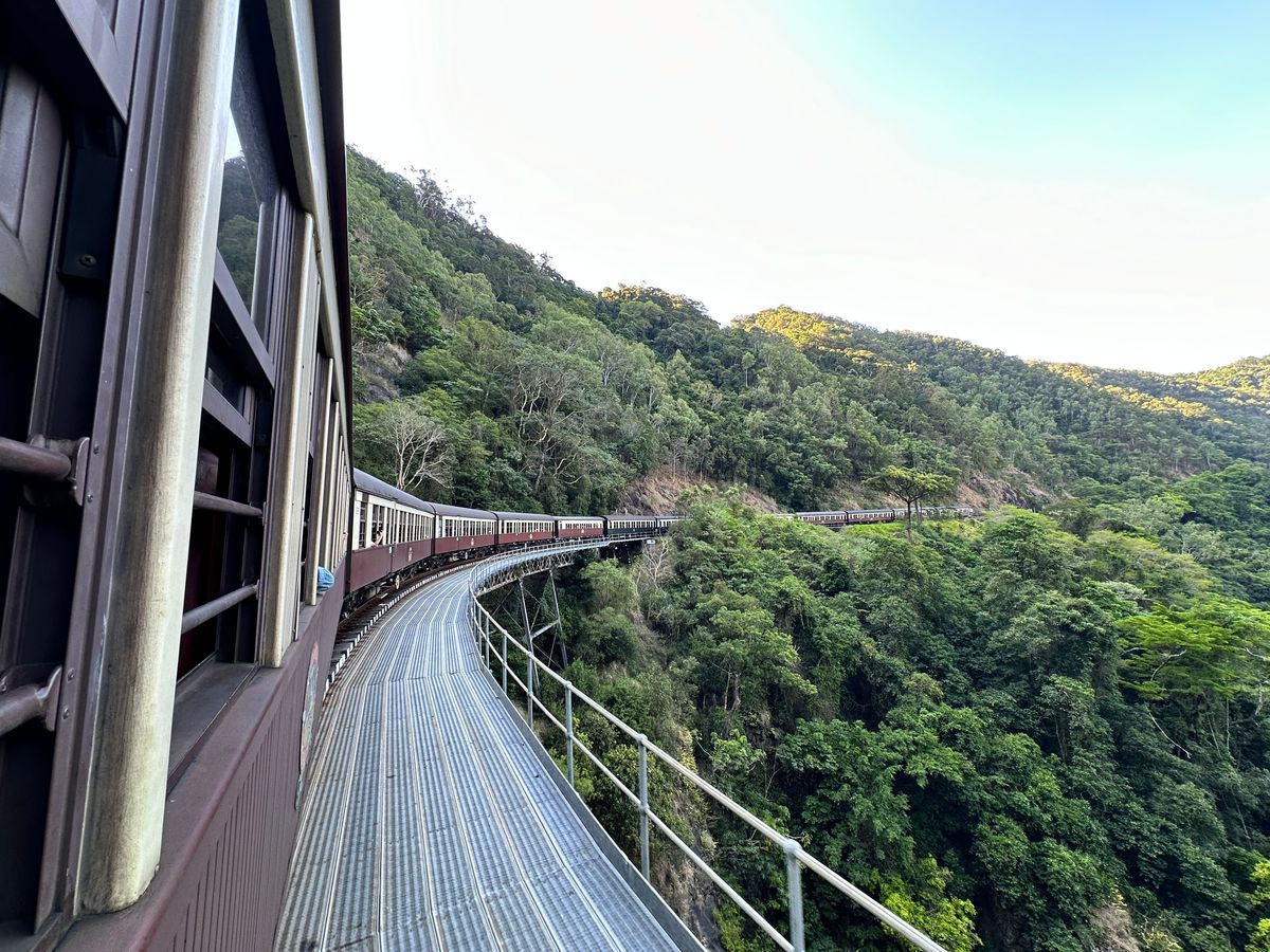 キュランダに向かうまでの列車の撮影スポットも的確でわかりやすく、席替えを利用して平等に皆が撮影できるよう工夫されていました。