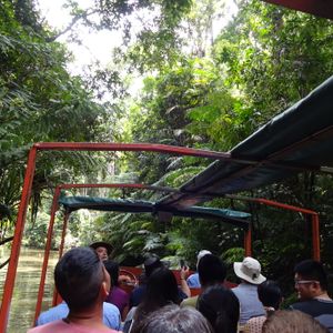 私たちが行った時、参加者が多かったので列車の窓側の席を半分で交代していました。列車は本当にゆっくり走り、窓から見える熱帯雨林や3回見たら幸せになれる蝶などを探しながら行っていたらあっという間に着きました。その後、私たちは、動物園付きのコースにしたので動物園へ。コアラとのツーショット写真やカンガルーの餌やり、その他にも沢山の動画を見ました。ご飯ブュッフェも充実しており美味しかったです。特に、カンガルーやクロコダイルのお肉は珍しくたべれて良かったです。そのが、自由行動で有名なアイスクリーム屋さんや、キュランダの街を探索してその後、スカイレールになりました。スカイレールは、意外と早く怖かったです。スカイレールの下には、アバターやジュラシックパークの世界でずっと見ていても飽きません。途中乗り換えがあるので、その乗り換え時熱帯雨林の散策もできました。スカイレールは、長さ世界二位(乗り換えを、作らなかったら一位だった)で個人の人が作り、木を行ってを切らなかったそうです。とても、充実したツアーでガイドさんも可愛くきさくな方でした。