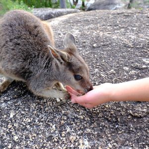 私たちの時は、たまたま道沿いの木にいたエリマキトカゲを見たり(よくもまあ運転中に見つけられたものです)、ロックワラビーの餌付けの場所で、飼われているニシキヘビを首に巻いて写真を撮ったり、いろいろな格好良いトカゲたちを触ったり、インコを乗せたりできました。