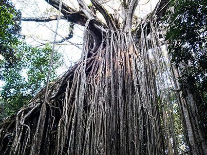 最初にガイドのナオさんからエサのやり方と注意点を教わったあとエサが配られ、各自エサやり開始。すぐに近寄って来て手のひらからエサを食べる姿は本当にカワイイ。エサが無くなるとジッとこちらを見る眼差しもさらにカワイイ。エサやりを堪能し愛くるしい眼差しに癒されたあとアサートン高原の[カーテン・フィグ・ツリー]へ移動。ボードウォークが整備されているので大変歩き易い。写真で見たことはあったが実際に森の中で見ると、その姿は雄々しく〝森の主〟然としていて、日本なら賽銭箱が置かれていてもおかしくない雰囲気。ここでだいぶ陽が傾き、いよいよ[カモノハシ探し]へ!!