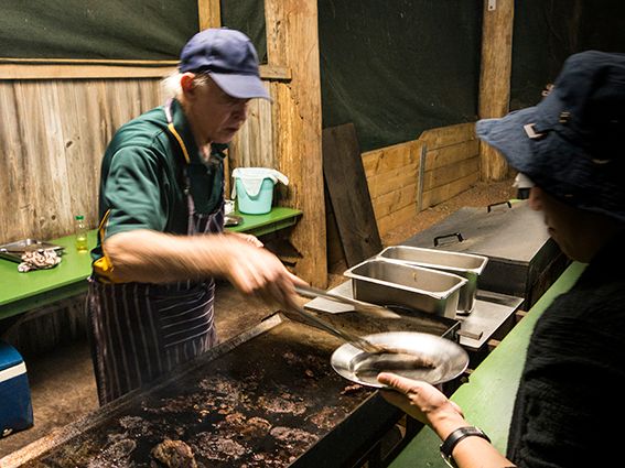 ワニとカンガルー肉の試食、オージービーフのステーキにソーセージ、サラダとパンが用意されていてどれも美味しい。食後に振る舞われたオーストラリアの伝統的なお茶[ビリーティー]も場の雰囲気に合っていて大変美味しかった。会場に数カ所エサ台があり、置かれたピーナッツにポッサムが訪れては無心に皮を剥いて食べていた。食後、星空を観るために360度見渡せる場所に移動したが惜しいことに満月の夜で、イメージしていた〝満天の星空〟とはならなかったものの《本が読める》といわれる満月の明かりは強く輝いていて、月に対する印象が変わった。
