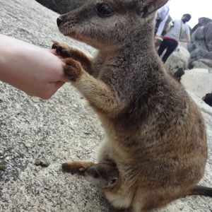 車窓からワラビーが跳ねるのを見ただけで嬉しかったのに、餌付けされているとは言え野生のロックワラビーと直に触れ合えたのに感激。前日動物園で見たやる気のないワラビーと全然違うんです!!生き生きした目、お腹から恐る恐る顔を出す赤ちゃん、喧嘩したのか傷だらけのオスワラビー。