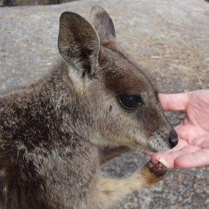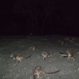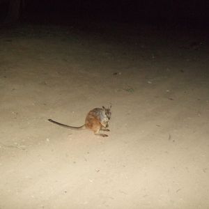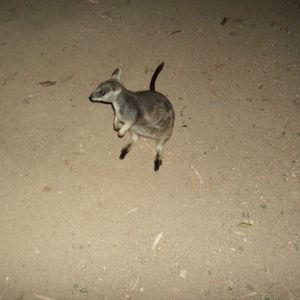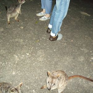 その日は雲が多くガイドのヨッシーさんの努力をもってしても星空は見られませんでしたが、片道1時間以上の道のりを軽快なトークで彼は盛り上げてくれました。山道がハイウエイになっており80km/h程で灯りのないところを走るのでレンタカーではやはり無理だと思います。途中から木の丈が短くなったところで蟻塚がたくさん見え始め高さ2m程のものを見学しました。どんなに大きい蟻がいるのかと思いきや日本にもいる普通の大きさの蟻で逆に驚きました。いよいよマリーバに入ってきたなと思うところで30センチ位のワラビーが車道際に見え期待度アップ。キャンプ場に着くと車の気配でロックワラビーがお客の数だけ6匹程寄ってきました。中には赤ちゃんがポケットからのぞいているワラビーもいて、凄く可愛かったです。餌やりをしていると「ワタシも~」と服に前足を掛けておねだりする子もいて本当に家で飼いたいぐらいでした。ここでしか見られない個体数の少ないワラビーだそうで観に行く価値はありますよ!