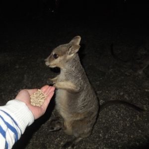 いつの間にかワラビーがたくさん集まってきました。えさを手にそっと近づけると両手を私の手にのせ、食べる仕草がかわいくて印象的でした。お母さんの袋から顔を出した赤ちゃんもいました。ワラビーは夜行性らしく、昼間動物園で見たワラビーより元気でかわいかったです。いい思い出になりました。