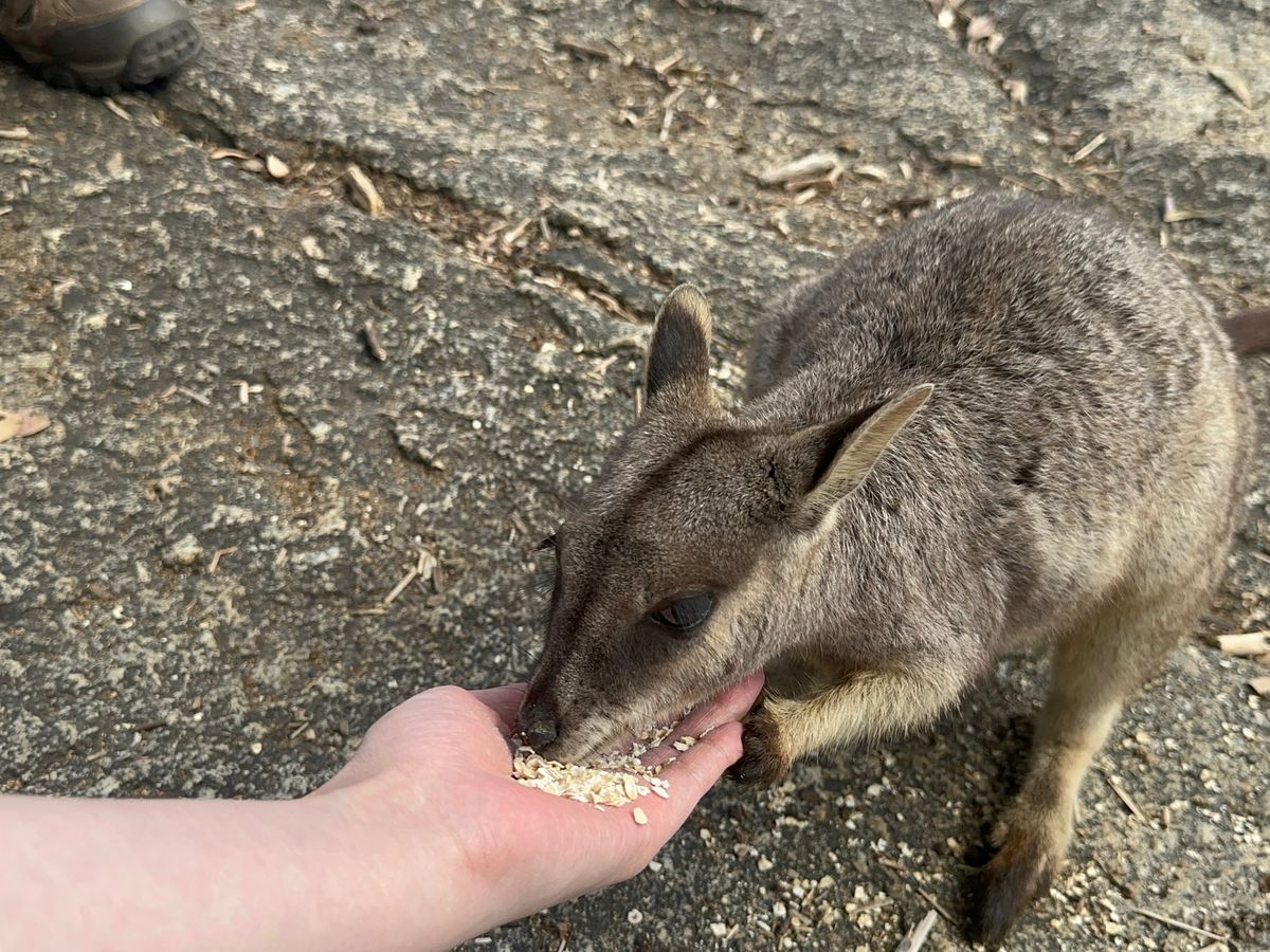 渓谷にてワラビーに餌あげ