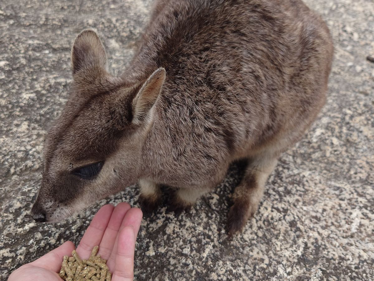 動物探検ツアーで蟻塚や野生のカンガルー探し、ロックワラビーへの餌付けなど盛りだくさんでした。