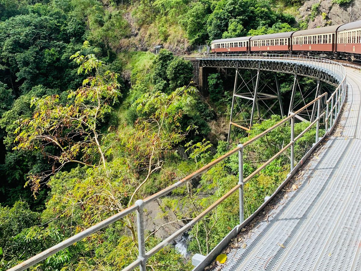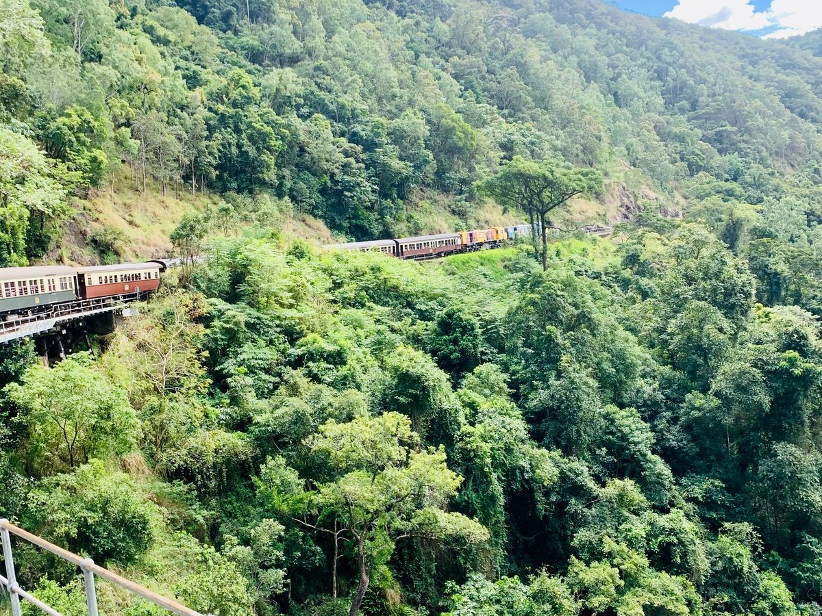 行きは鉄道、帰りはスカイレール。個人的にはスカイレールがあまりにも良くてまたスカイレールに乗りに行きたいと思いました。主人はスカイレールの途中10分ほど降りたところの散策が気に入っておりました。キュランダの街は大きくないのでぜひアーミーダックにのるツアーをお勧めします。青い蝶を見たり、珍しい植物に感動しました。参加させてもらい大満足です。
