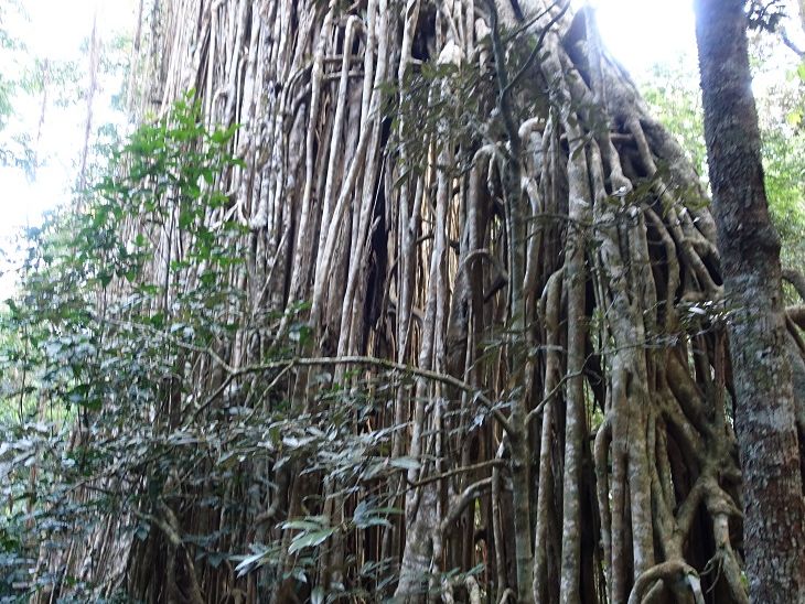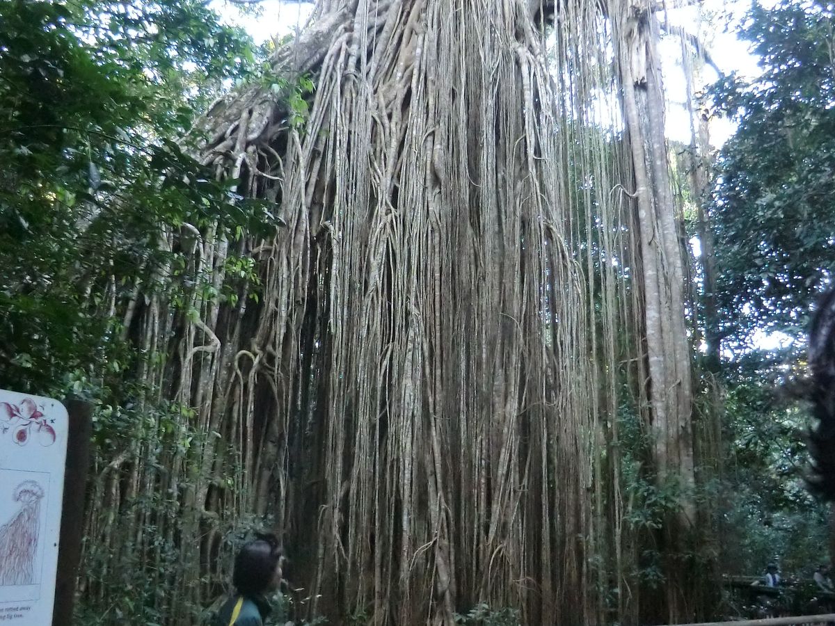 午前のキュランダに力を入れていたので、その後の「野生動物体験」についてはあまり考えていなかったのですが、バスで移動しながら、そのとき、その地に姿を見せる動物を車窓から、あるいは、バスを降りて探索するミニトリップでした。偶然の出会いに期待する旅か~と途中で気づきました(笑)。アリ塚のシロアリ、カンガルー、ロックワラビー、カワセミ、オウムなどなど。すごいイチジクの木も見ました。残念ながらカモノハシは私は見ることができなかったのですが、一緒のグループの方が撮った動画を夕食時に皆で鑑賞。動物園とはまた違う楽しさがありました。ガイドの方も運転手の方もフレンドリーに接してくださり、楽しい時間となりました。