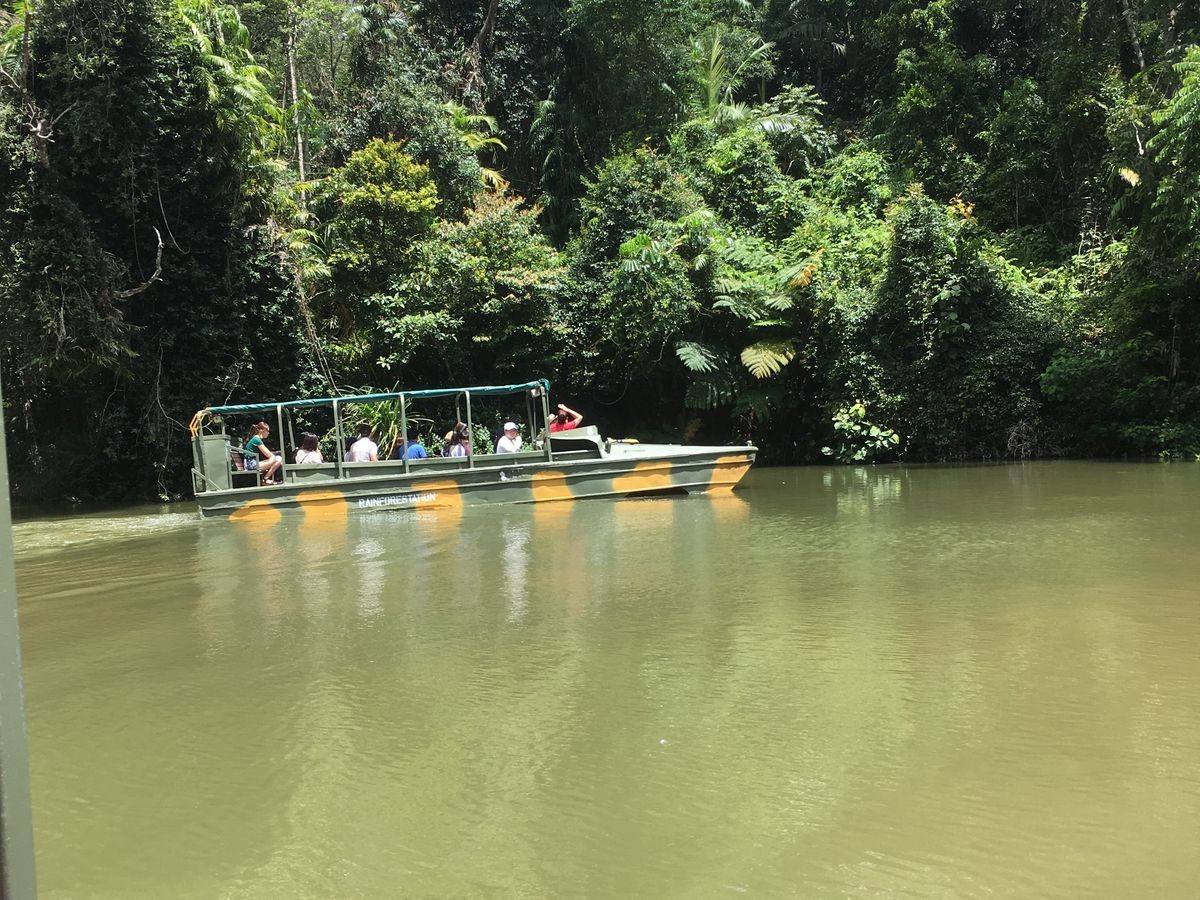 あいにくケアンズに台風が来ていて、雨が多い予報でしたが、合間に曇りになったり晴れたりして、スカイレールからのジャングル風景は楽しめました。アーミーダックは想像より楽しく、ガイドのリノさんと運転手さんの掛け合いが面白かったです。ランチビュッフェとミニ動物園の時間が慌ただしく、あまり楽しめませんでした。キュランダ鉄道が崖崩れで運休は残念でしたが悪天候の中最低限度の観光はできたと思います。ガイドさんの頑張りに感謝。
