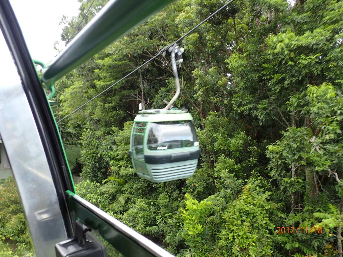 今回はホテルにバスで送迎があり、スカイレールでキュランダへ。スカイレールは思いの外高い視線。世界遺産の原生の熱帯雨林の上を通ります。途中バロンフォールの見える場所を通過しますが、なぜか通過だけ。その理由はあとでわかります。