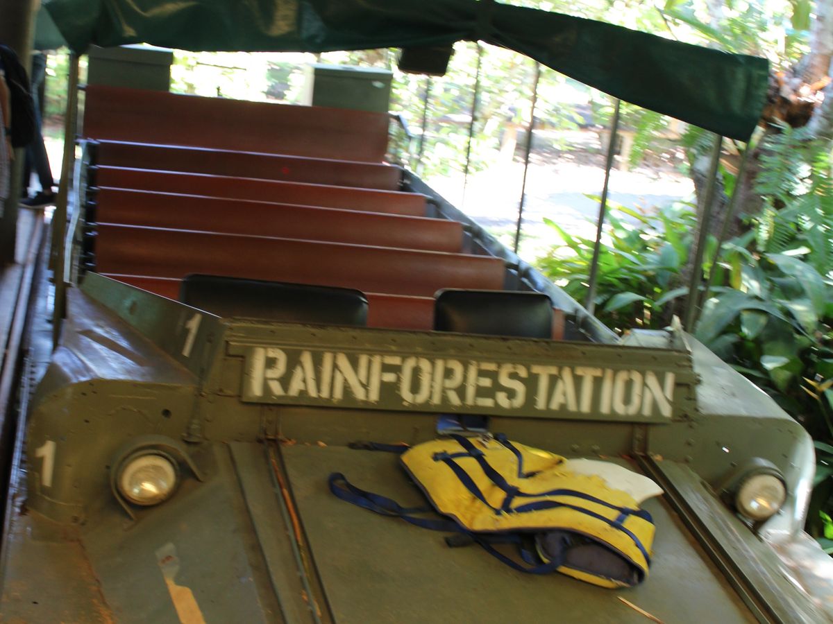 列車を降りた後、レインフォレステーションでアーミーダッグに乗りました。美しい森の中には意外と危険な植物がいっぱいある事を知りました。見たら幸せになれるという蝶も舞っていて運が良かった。