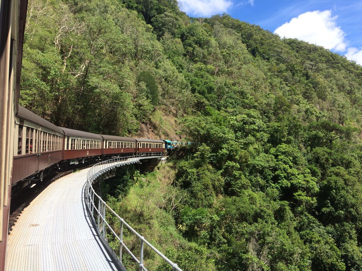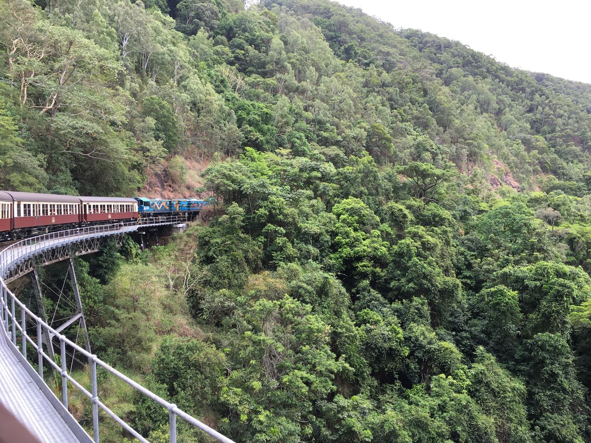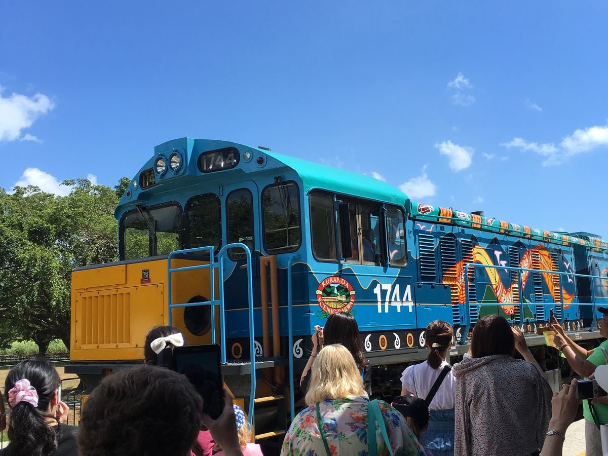 私たちが行った時、参加者が多かったので列車の窓側の席を半分で交代していました。列車は本当にゆっくり走り、窓から見える熱帯雨林や3回見たら幸せになれる蝶などを探しながら行っていたらあっという間に着きました。その後、私たちは、動物園付きのコースにしたので動物園へ。コアラとのツーショット写真やカンガルーの餌やり、その他にも沢山の動画を見ました。ご飯ブュッフェも充実しており美味しかったです。特に、カンガルーやクロコダイルのお肉は珍しくたべれて良かったです。そのが、自由行動で有名なアイスクリーム屋さんや、キュランダの街を探索してその後、スカイレールになりました。スカイレールは、意外と早く怖かったです。スカイレールの下には、アバターやジュラシックパークの世界でずっと見ていても飽きません。途中乗り換えがあるので、その乗り換え時熱帯雨林の散策もできました。スカイレールは、長さ世界二位(乗り換えを、作らなかったら一位だった)で個人の人が作り、木を行ってを切らなかったそうです。とても、充実したツアーでガイドさんも可愛くきさくな方でした。