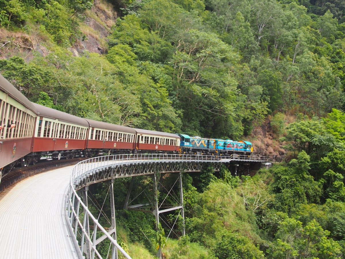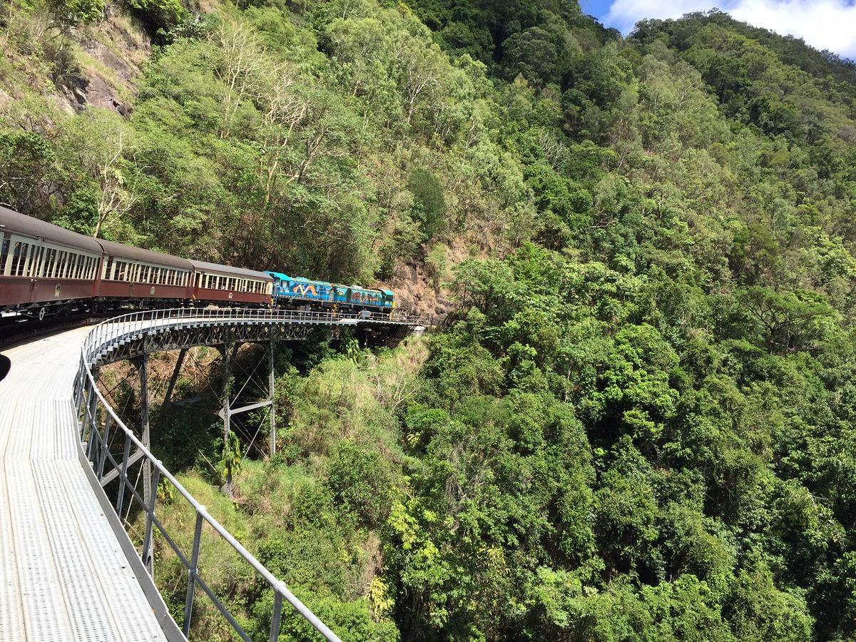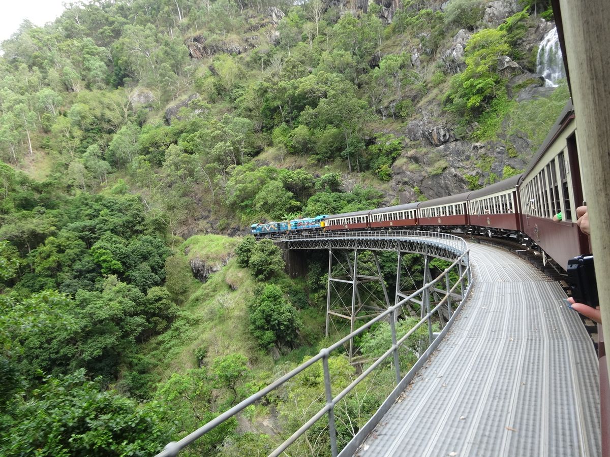 私たちが行った時、参加者が多かったので列車の窓側の席を半分で交代していました。列車は本当にゆっくり走り、窓から見える熱帯雨林や3回見たら幸せになれる蝶などを探しながら行っていたらあっという間に着きました。その後、私たちは、動物園付きのコースにしたので動物園へ。コアラとのツーショット写真やカンガルーの餌やり、その他にも沢山の動画を見ました。ご飯ブュッフェも充実しており美味しかったです。特に、カンガルーやクロコダイルのお肉は珍しくたべれて良かったです。そのが、自由行動で有名なアイスクリーム屋さんや、キュランダの街を探索してその後、スカイレールになりました。スカイレールは、意外と早く怖かったです。スカイレールの下には、アバターやジュラシックパークの世界でずっと見ていても飽きません。途中乗り換えがあるので、その乗り換え時熱帯雨林の散策もできました。スカイレールは、長さ世界二位(乗り換えを、作らなかったら一位だった)で個人の人が作り、木を行ってを切らなかったそうです。とても、充実したツアーでガイドさんも可愛くきさくな方でした。