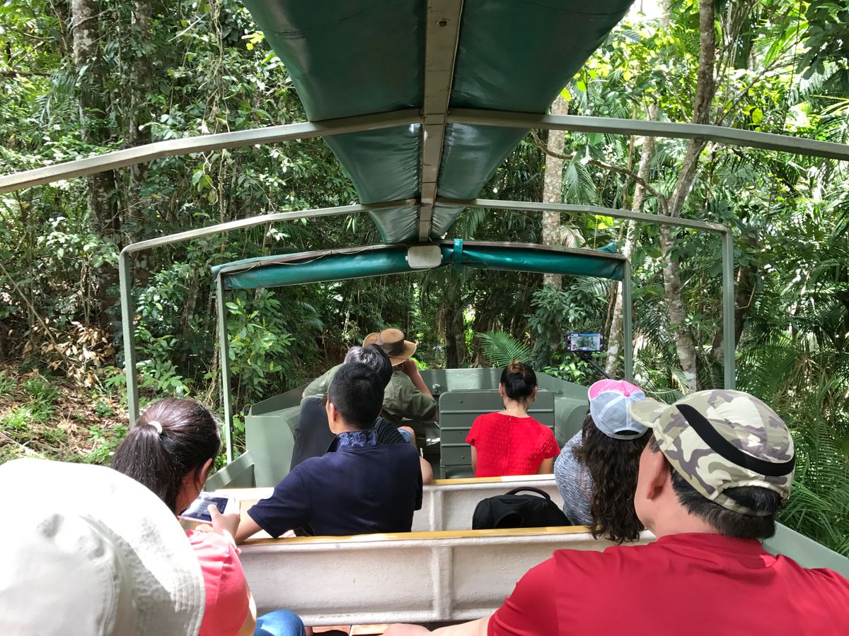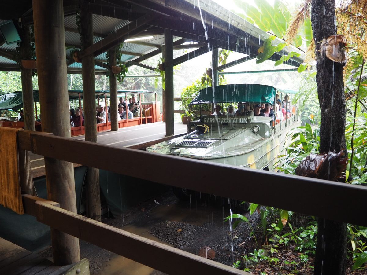 私たちはガイドさんと同じスカイレールだったので、熱帯雨林の植物の説明や、向こう側に滝が流れている、などの説明が受けられてラッキーでした。また、スカイレールからユリシスやキバタンも見ることができました。その後、下車してランチタイムです。バイキングでは、特にオージービーフのステーキがおいしかったです。フルーツもたくさんありました。ランチが終わった人から、小さな動物園に行きます。コアラやカンガルー、タスマニアデビルやウォンバットがいました。その後、水陸両用車であるアーミーダックに乗りました。迫力があって楽しいです。また、ユリシスも何回か見ることができ、ラッキーでした。