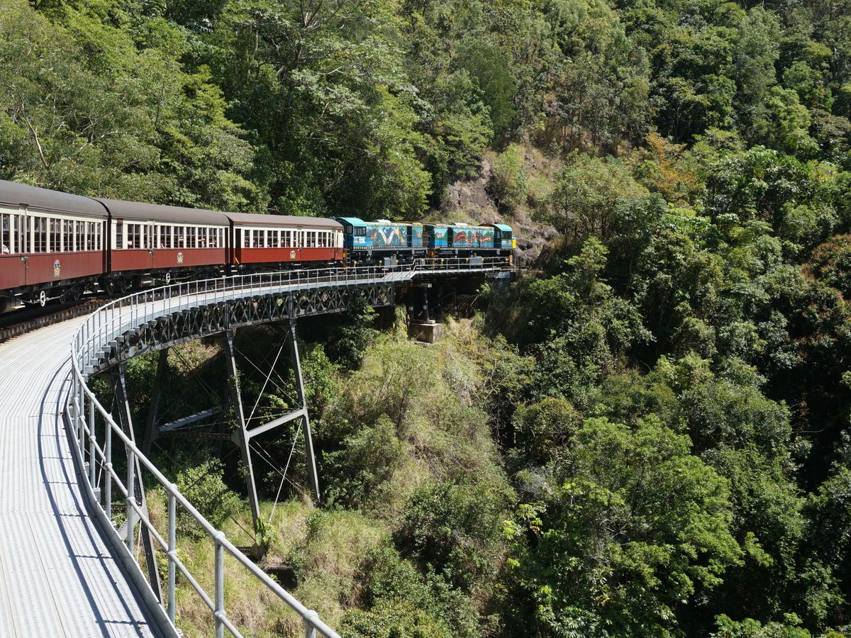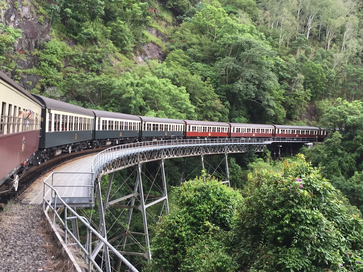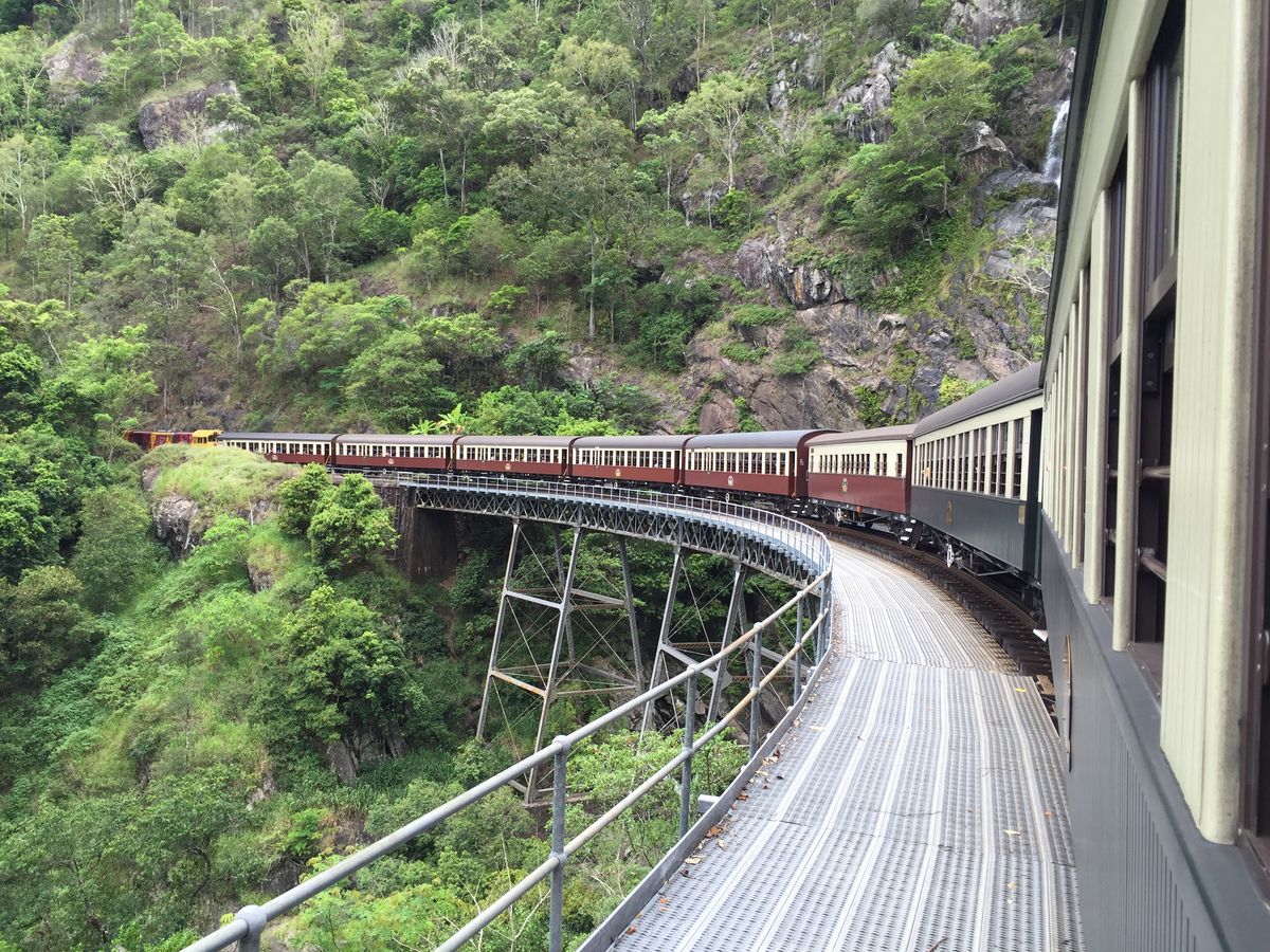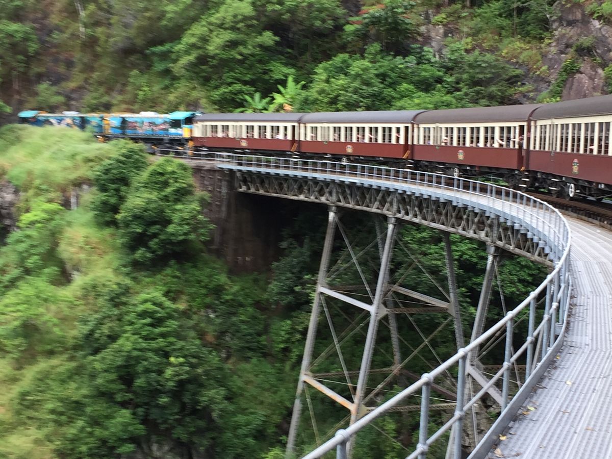 朝、迎えの車に乗り込みスカイレールへ。お天気も良かったので良い眺め。そこからキュランダを観光し、特にこれって物はないが、町を散策するのも楽しかった。途中、有名なホットドックも食べれたし。そして帰りは2時間の列車の旅。なかなか海外で2時間山の中をのんびり走れる事はないので良い経験になりました。大人だけの旅行の時はオススメ。(お子さんは2時間の列車が飽きてしまうかも)