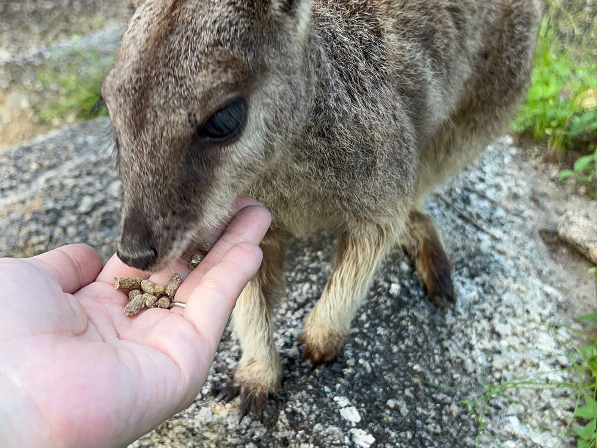ワイルドライフパークはこじんまりとした動物園にカンガルーが2頭放し飼いしており、入口の受付でかったコアラの餌をあげることができて、子供のテンションはMAXでした!