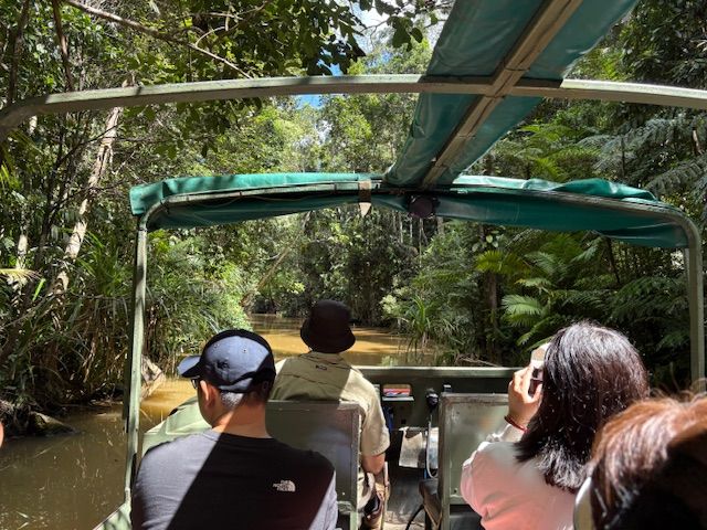 ホテル近くからバスでスカイレール乗り場まで行き、スカイレールで空から熱帯雨林を眺めました。途中2か所に止まり、散策している時は、熱帯雨林の中を歩いている感じがしました。キュランダ村に到着して、シャトルバスに乗り、アーミーダックへ。軍事用の水陸両用車で陸から、水上から熱帯雨林を体感しました。その後またキュランダ村に戻り、ブラブラ散策したのち、キュランダ鉄道に乗車。スカイレールからと鉄道からバロン滝を見ることができました。いろいろな乗り物に乗れたのも楽しかったです。