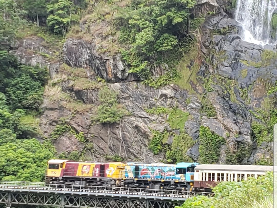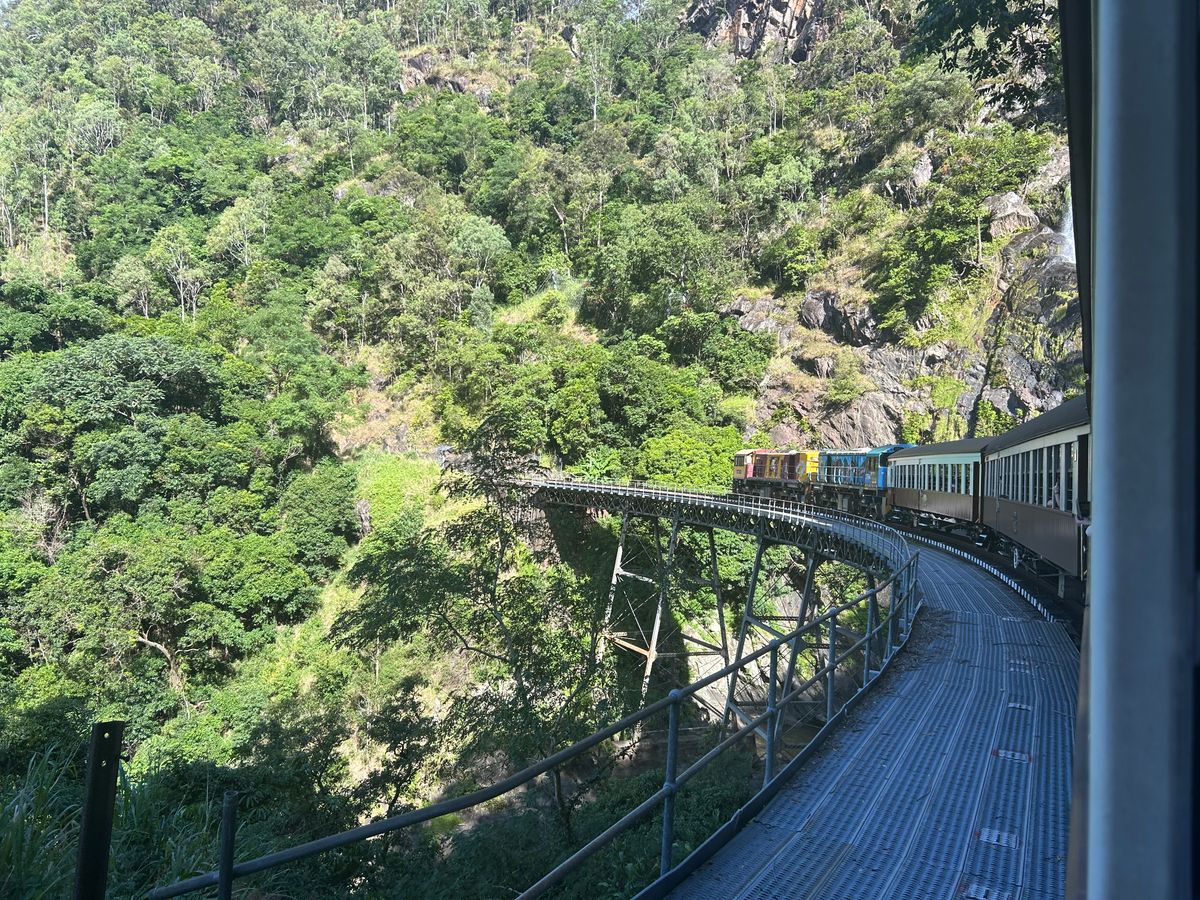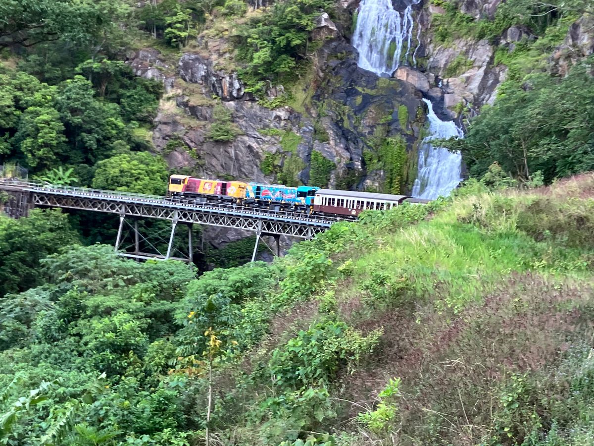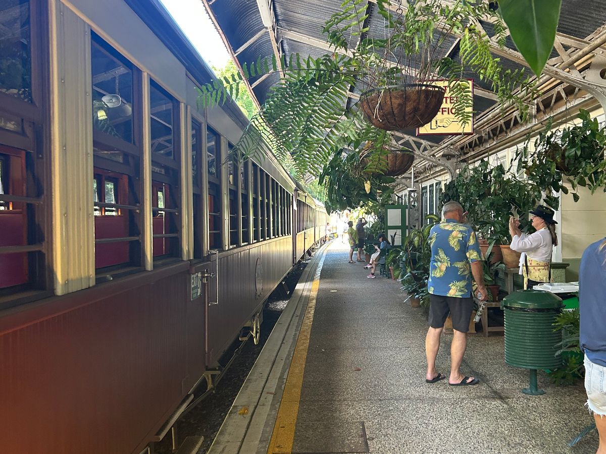 ケアンズで絶対行きたかったとこ。列車は窓際だとあの長い列車を撮れるけど私は通路側だったので窓際のご家族に気をつかいながら写真を撮りました。でも窓から見える景色は良かったです。駅に到着後の散策やアボリジナル体験など楽しかったです。カンガルーとも触りながら写真が撮れたし、全て素敵な思い出です。