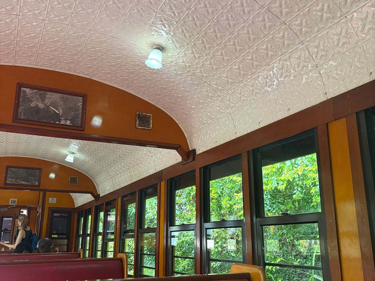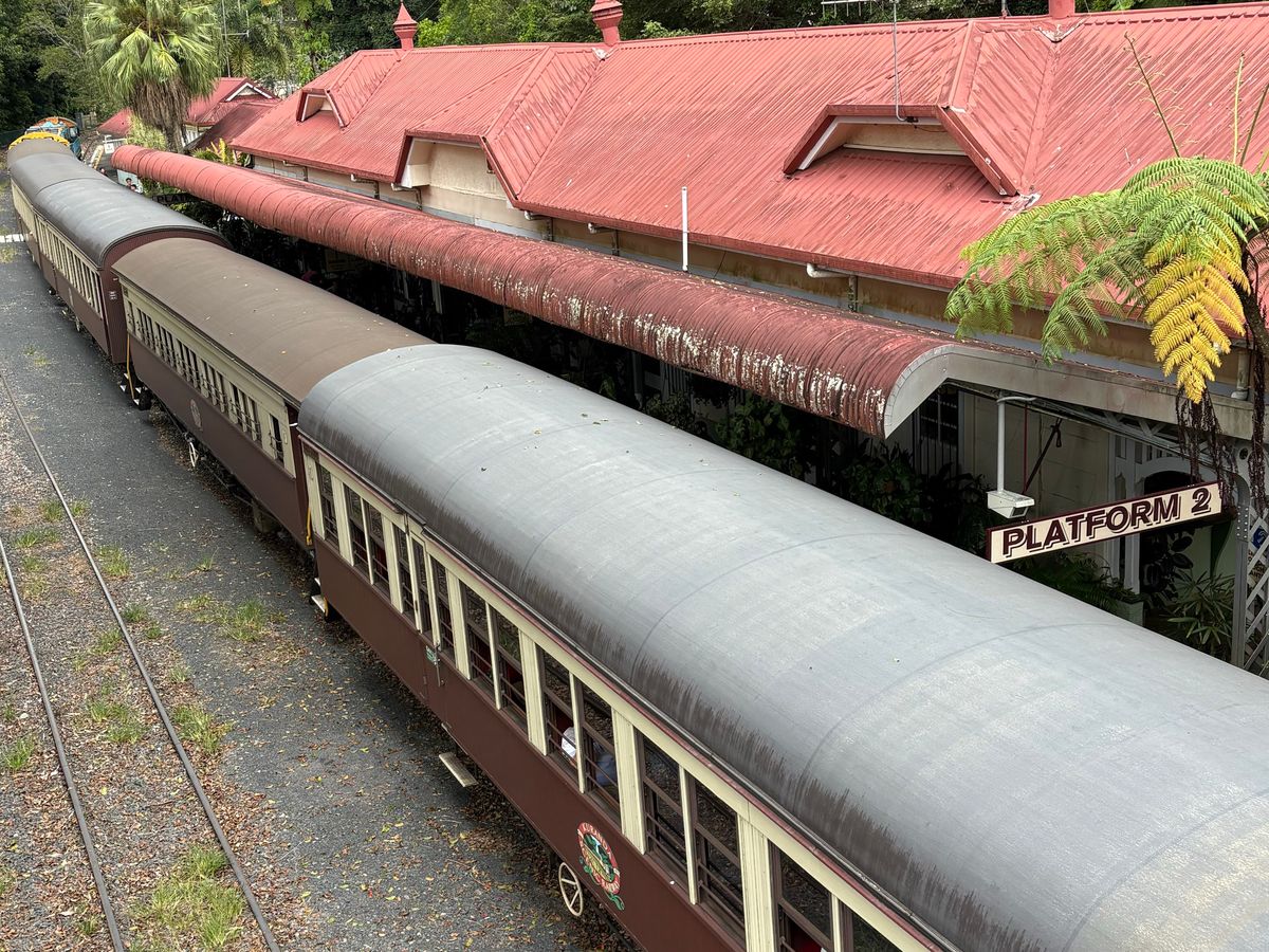 キュランダ鉄道は約1時間半。14両編成のエアコンなしの観光列車ですが、