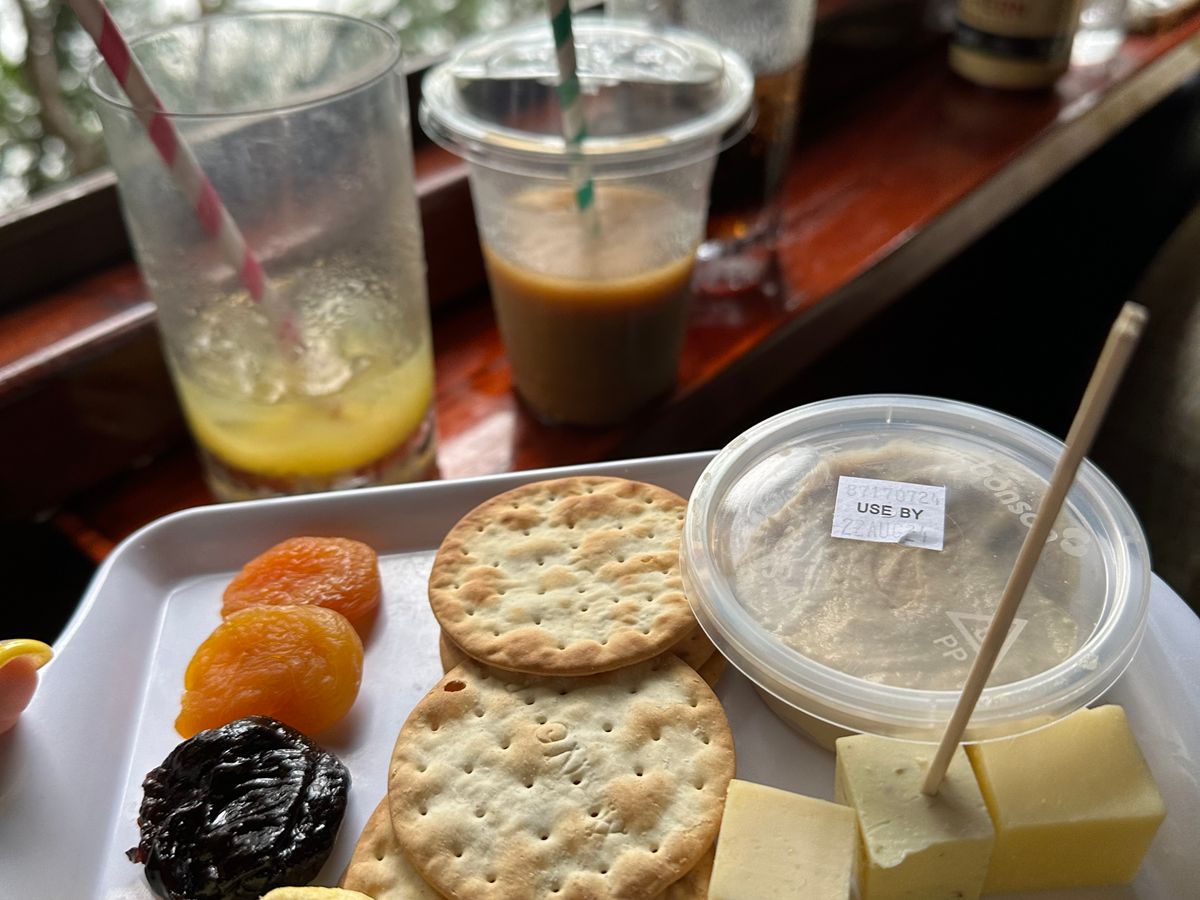 帰りの鉄道ではゴールドクラスにアップグレードしましたが、大正解でした。ドリンクサービスでは、私はワインを2杯いただきましたが、前に座っていた男性は缶ビールを5本くらい飲んでいました。他にも、マカダミアナッツ、チーズとクラッカー、ドライフルーツ、そして最後にはマンゴーのアイスクリームまで提供されました。早めに予約したおかげで、座席も進行方向の左側窓席で景色が素晴らしく、絶景を楽しむことができました。