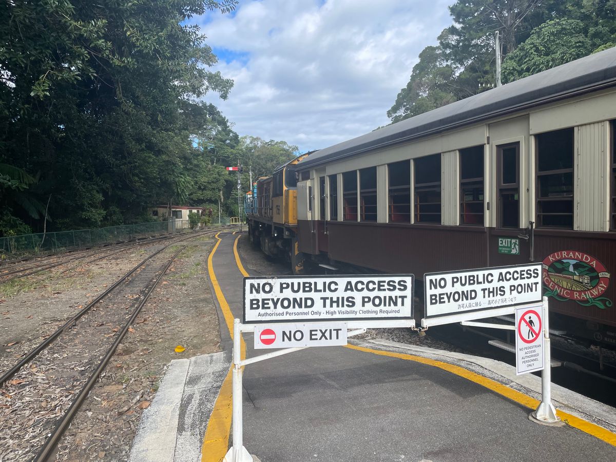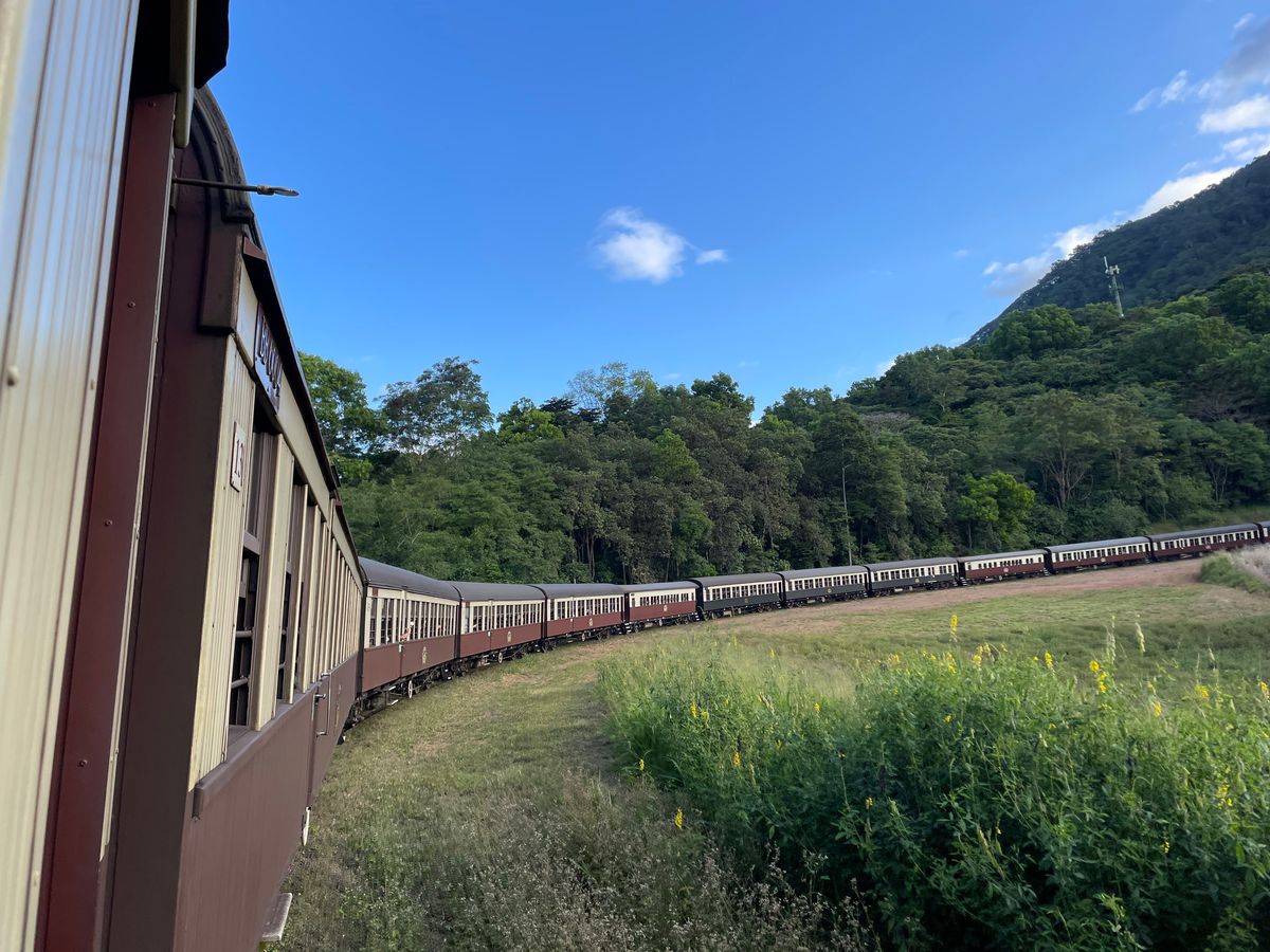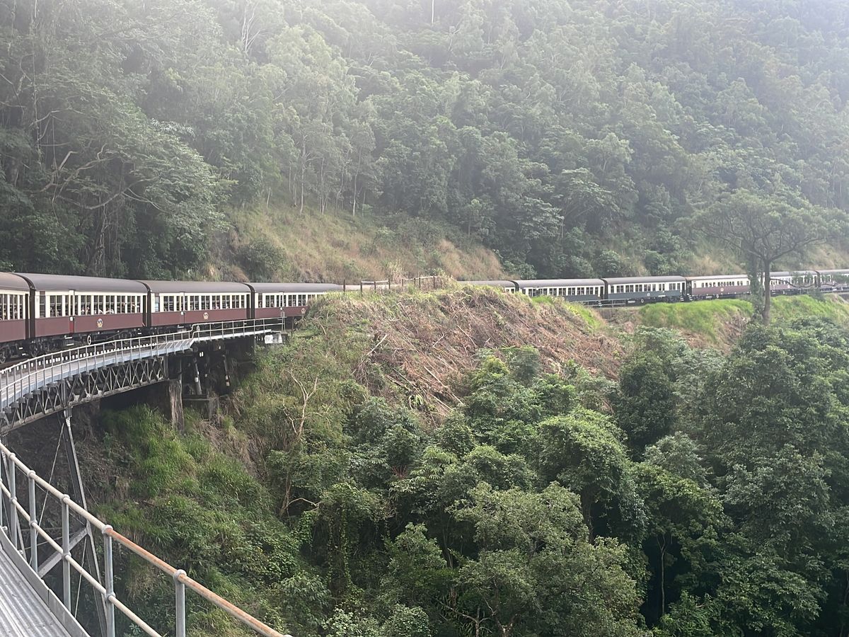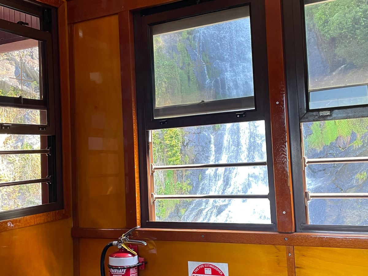 TV世界の車窓からのキュランダ、私達が駅に着いた時まだ前の便が故障で出てなくあわや欠便?かと焦りましたが幸い遅ればせながら出発でき殊更キュランダの列車と景色を嬉しく感じました。駅も工事の歴史が写真やパネルでわかりやすく説明してあり飽きません。途中の駅の撮影タイムは列車と滝の良い写真が撮れます。