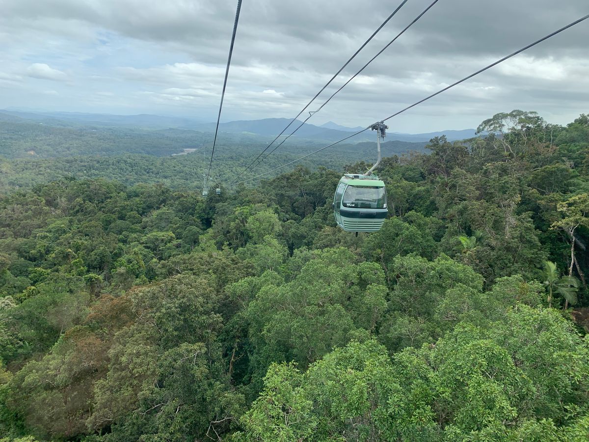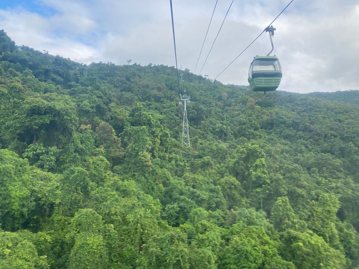 1つ目はスルーしてください、2つ目は乗り換えてください(混んでるときに1つ目で降りると再乗車に30分から1時間待つことになってしまうようです)。当日はスカイレールがすいていたので、スカイレールのチェックインを終えたガイドさんから作戦変更案内(1つ目途中下車して滝を見て再乗車、2つ目は乗り換え)。すいていたので、ガイドさんが係員に言って2名でゴンドラに乗せてくれました。スカイレールから見る熱帯雨林の森は雄大です。写真では質感が伝わらない景色でした。天気がよくて&2名乗車で最高でした!!