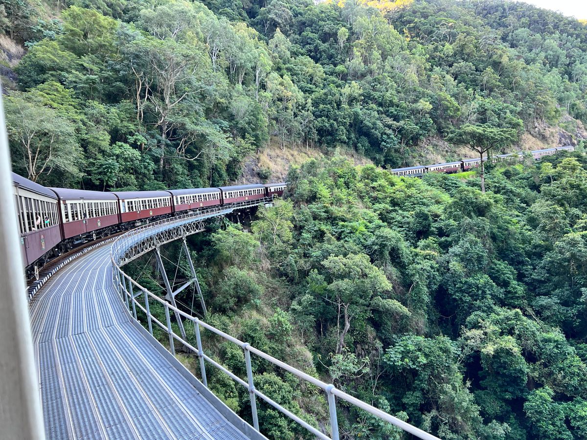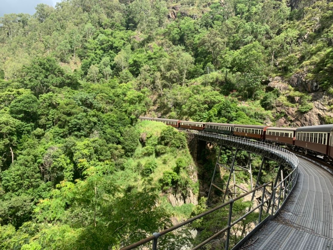 往路でキュランダ鉄道に乗車。「世界の車窓から」の風景が見られて素晴らしかった!また、復路のスカイレールからもジャングルを見下ろす景色が圧巻でした。