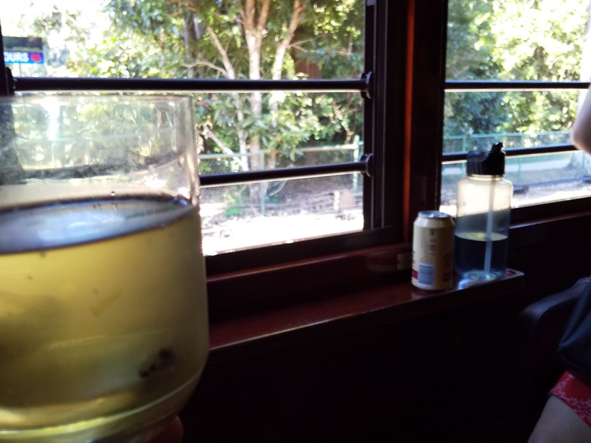 帰りは憧れのキュランダ鉄道。思い切ってゴールドクラスにしたおかげで大変優雅な時間を過ごせました。ゴールドクラスでは乗車中アルコール類が飲み放題。チーズやドライフルーツのツマミ、マンゴーのシャーベットも貰えます。ちょうど列車の真ん中あたりなので、ビューポイントでは前を走る車両と後ろに連なる車両をどちらもカメラに残すことが出来ました。座席も優雅なソファで窓際。じっくりビューを楽しめます。今回はゴールドクラスに欧米系やオーストラリアの他の都市からの観光客が多く、彼らと一緒に過ごすことで、より海外旅行感を味わえたこともよかったです。