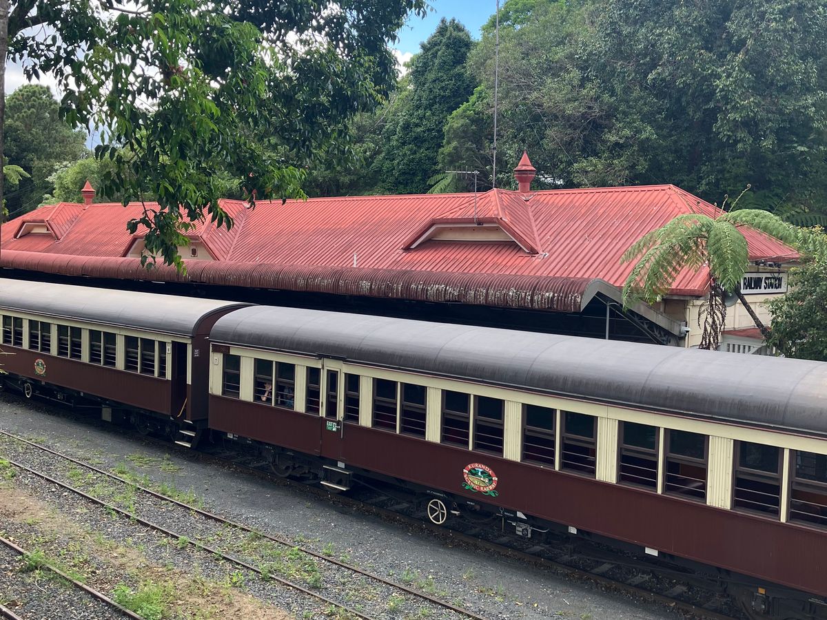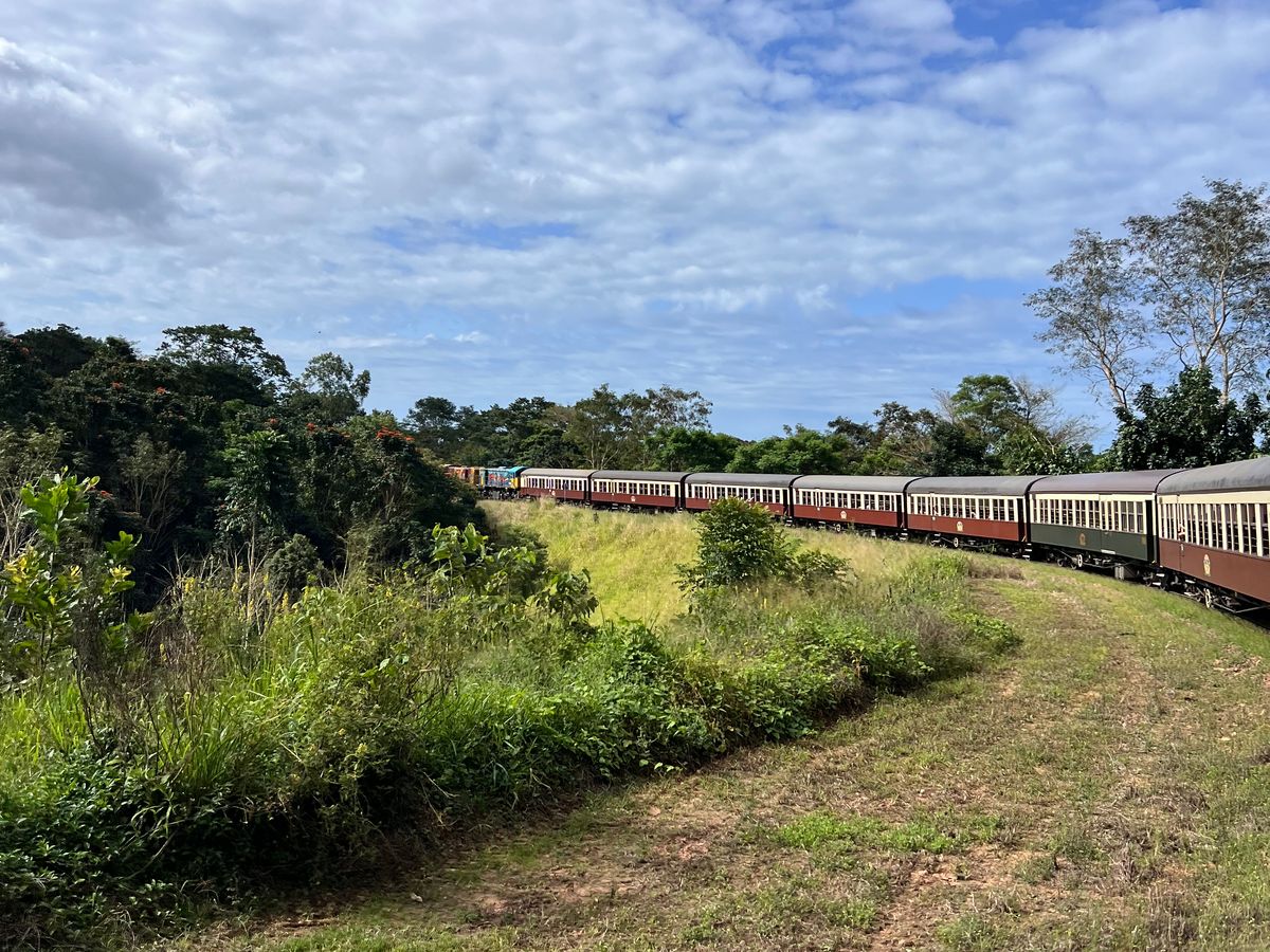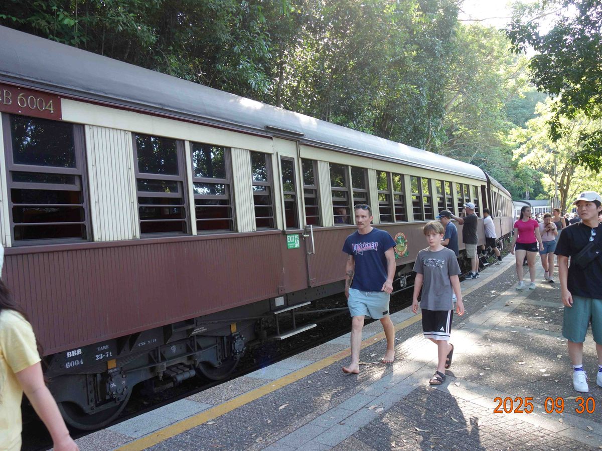 ケアンズの初夏に鉄道に乗りましたが、冷房が無いので結構暑かったです。お水等の飲み物忘れずに。
