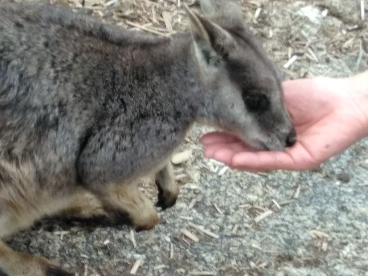 レインフォレステーションにあるミニ動物園では放し飼いのワラビーを触ることができ、もう感無量!