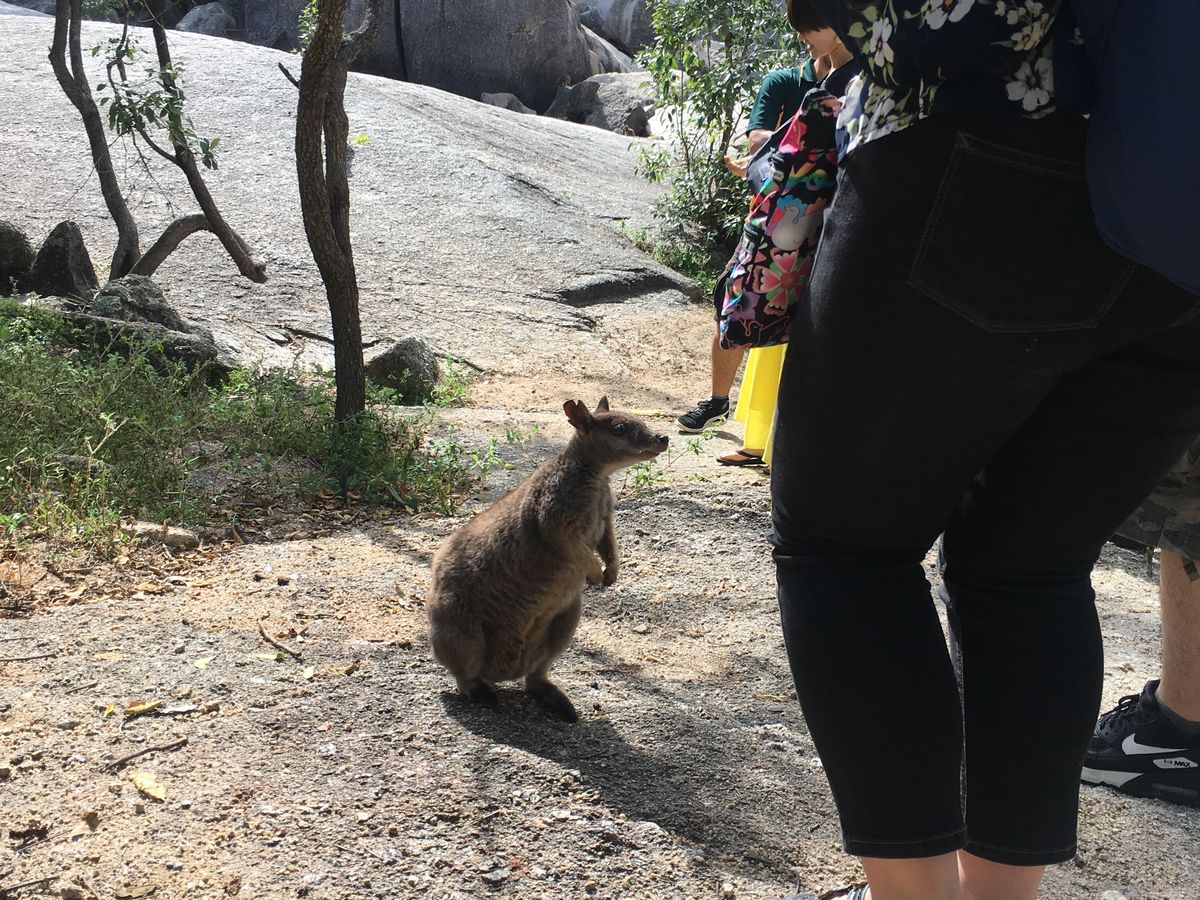 ロックワラビーが住んでいる場所を訪れ、直接ご飯をあげる体験も。とても小さく、背中の毛はふわふわしてして可愛かったです。お腹の袋の中にいる赤ちゃんも見ることができました。